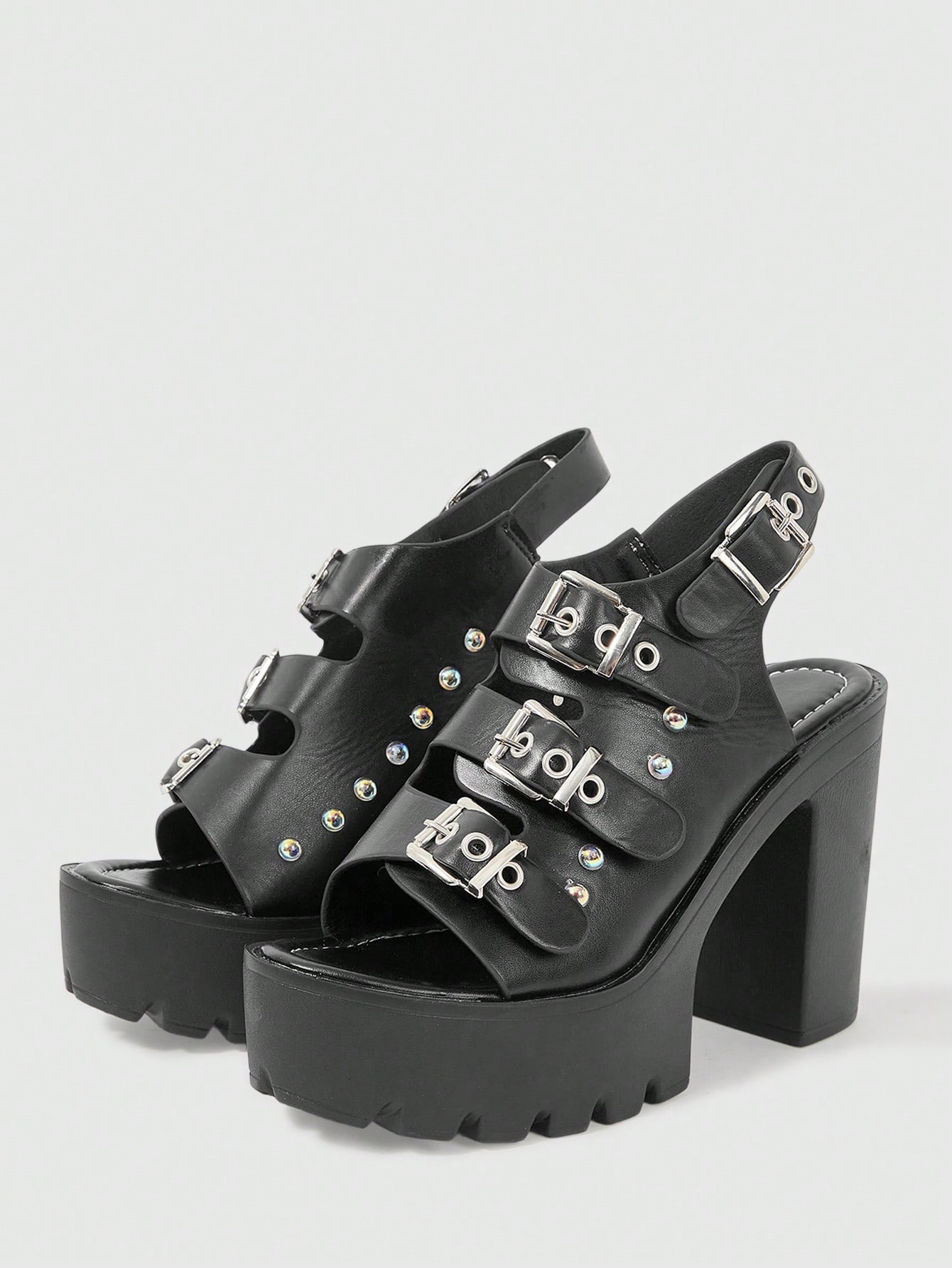 Goth Zapatos de tacón estilo gótico y punk para mujeres, con punta descubierta y tacón grueso, cierre con hebilla de cinturón, adecuados para vestidos formales de trabajo, fiesta y noche, sandalias de tacón alto