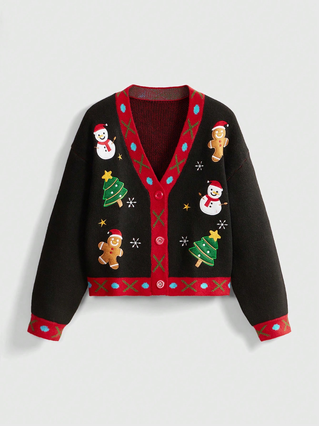 Cárdigan de mujer con contraste de color tejido con bordado de hombre de jengibre y muñeco de nieve de Navidad