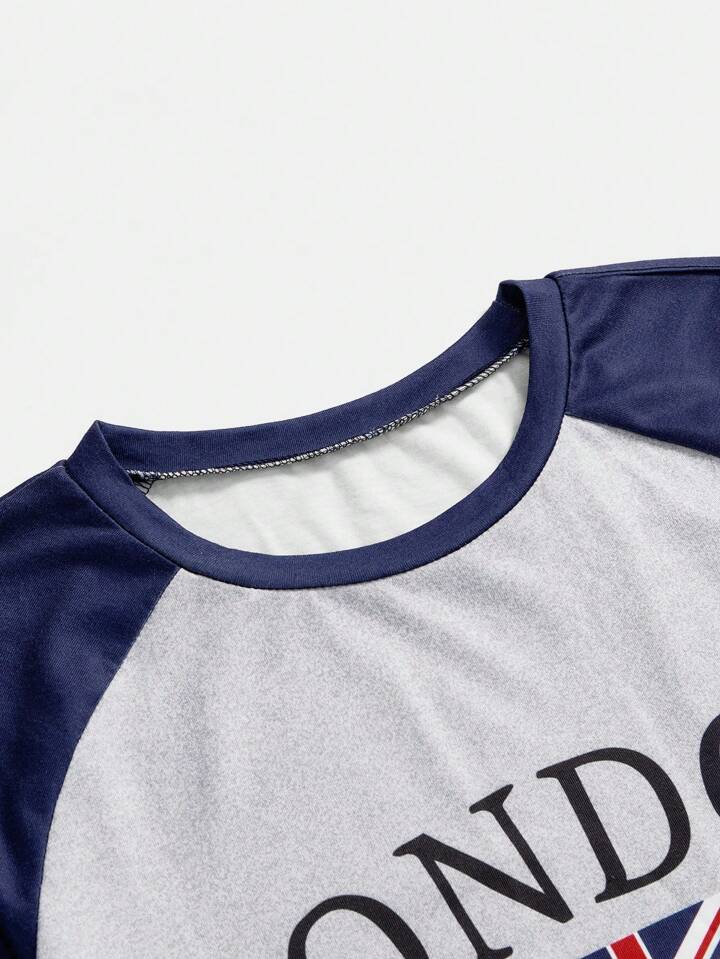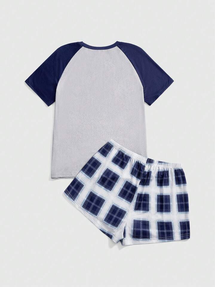 Conjunto de pijama casual de mujer con mangas raglán de manga corta y pantalones cortos, estampado a cuadros con bandera, ajuste cómodo, para verano