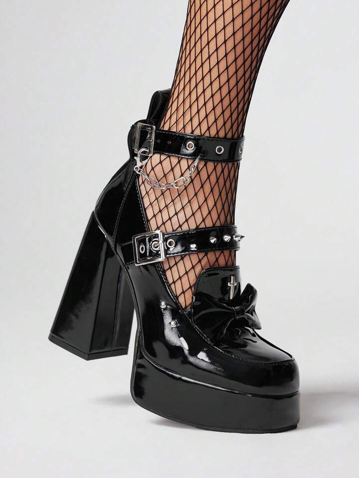 Goth Zapatos de tacón alto de estilo gótico y punk para mujer, de punta cerrada, color negro, con correa, stilettos delgados, plataforma impermeable, tacones bajos para vestir, zapatos de tacón para eventos