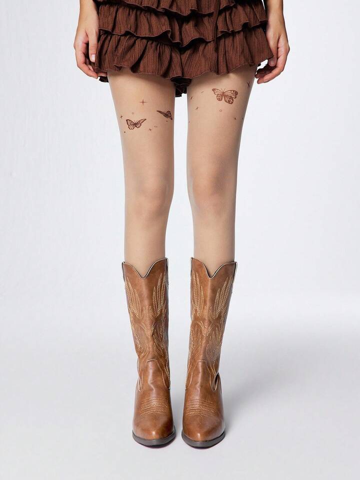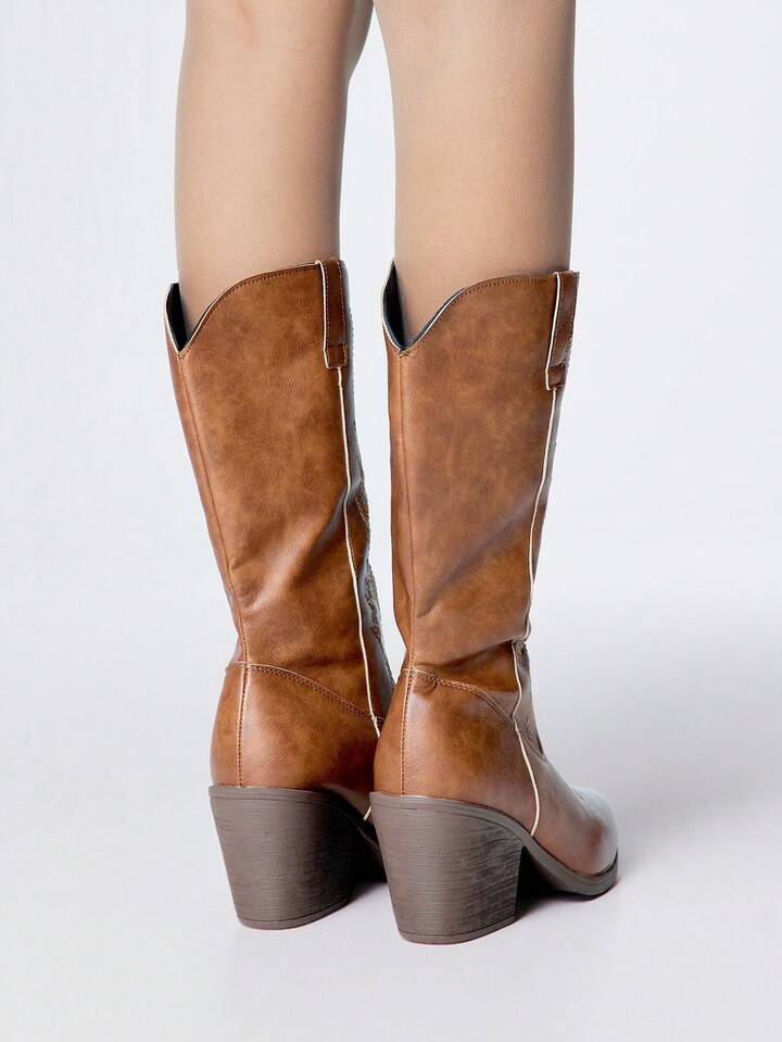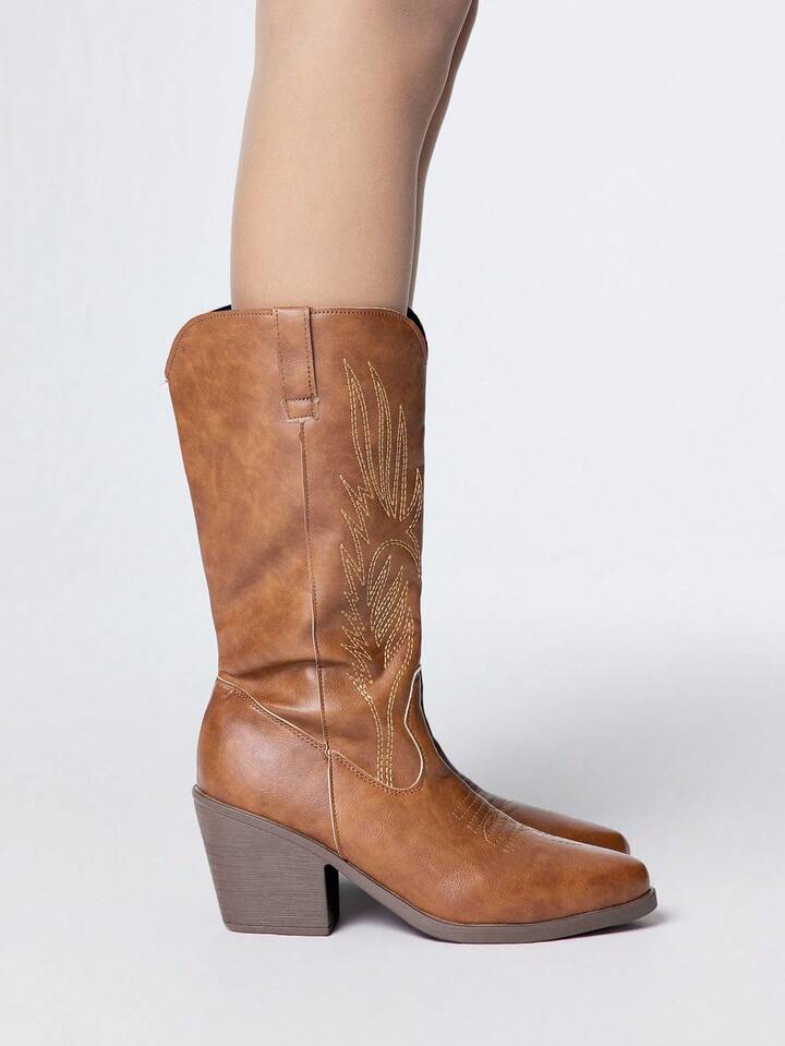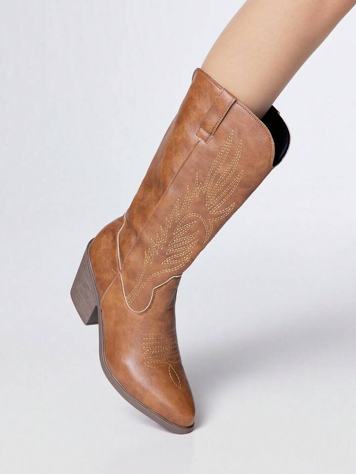 Botas vaqueras para mujer, botas de montar occidentales de tacón grueso y punta puntiaguda con bordados, botas de moda para exteriores de media caña con cierre de slip-on