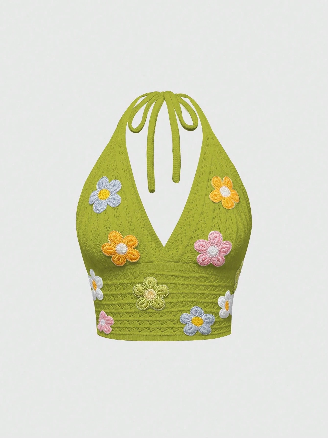 Top de vacaciones con cuello halter de flores a crochet para mujer