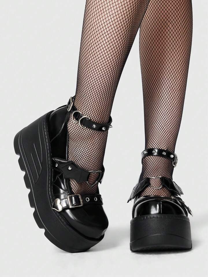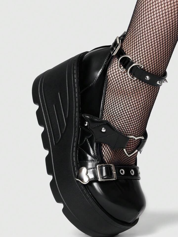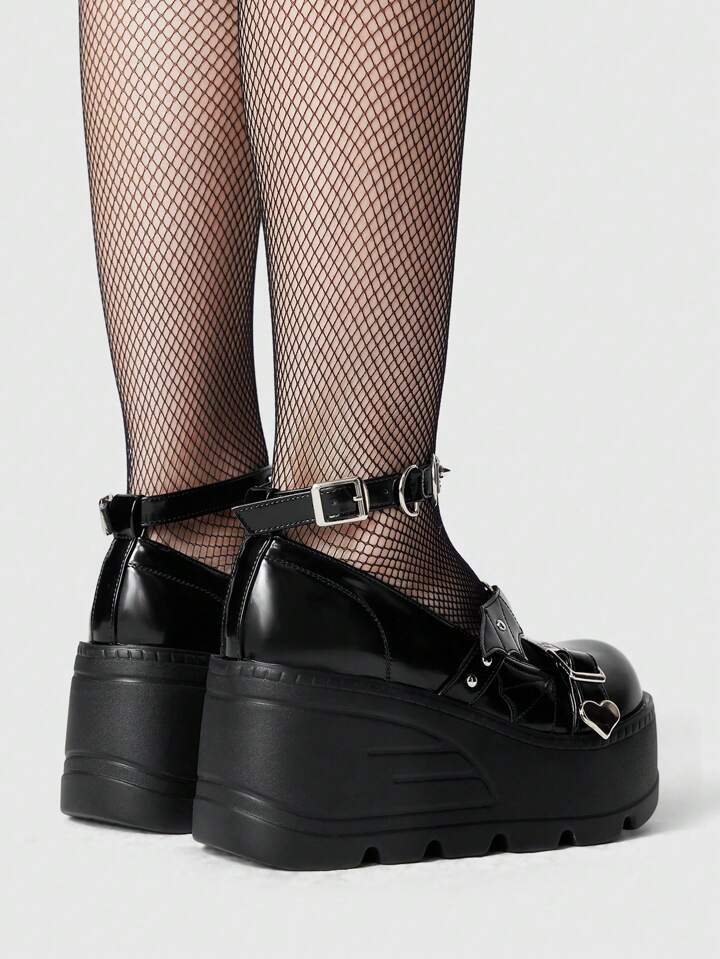 Goth Zapatos de mujer de estilo JK con plataforma y cuña, tipo bailarina Mary Jane con cierre, hebilla y moño, de estilo punk gótico con detalles de ala oscura y corazón