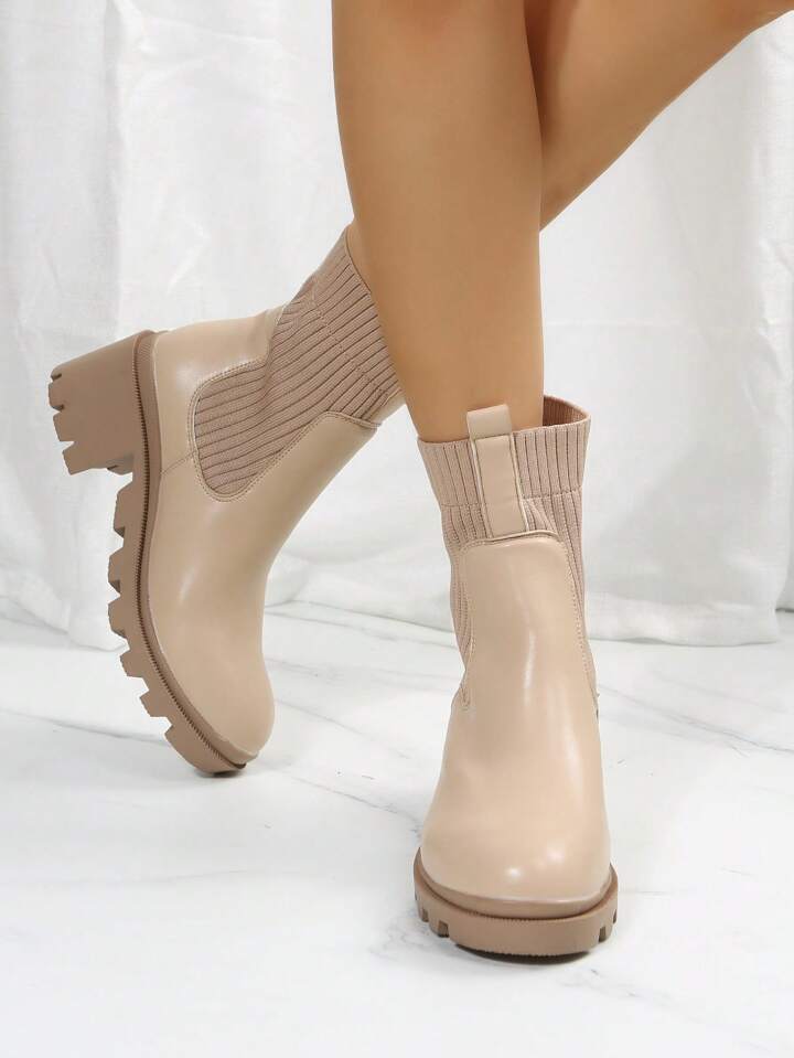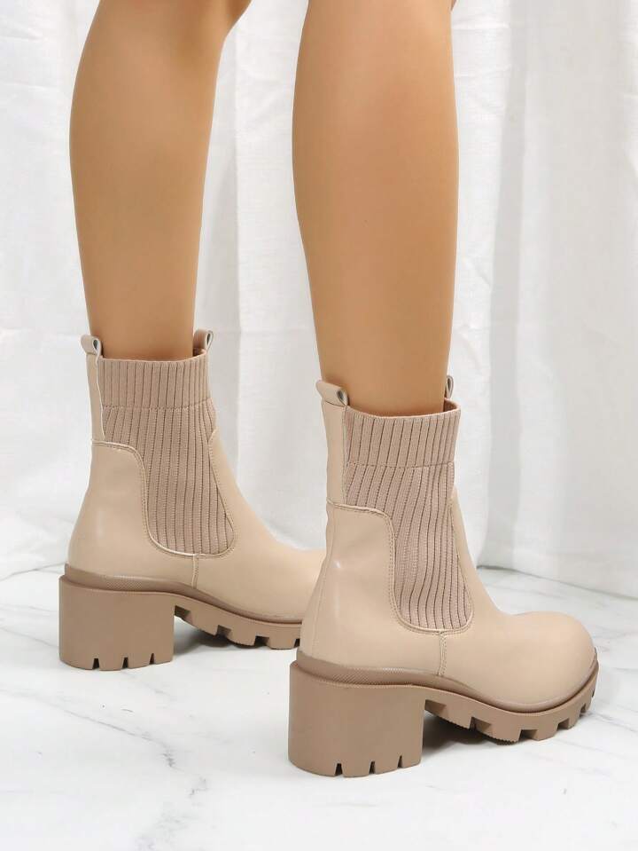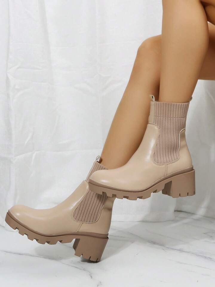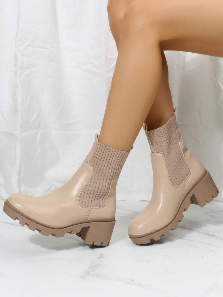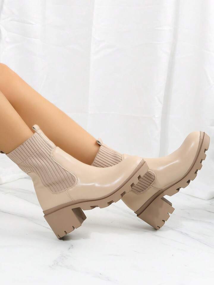 Botines de mujer de tacón ancho con slip-on, botas media pantorrilla, botas cortas de invierno cálidas