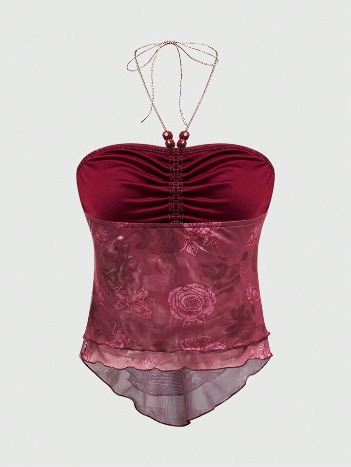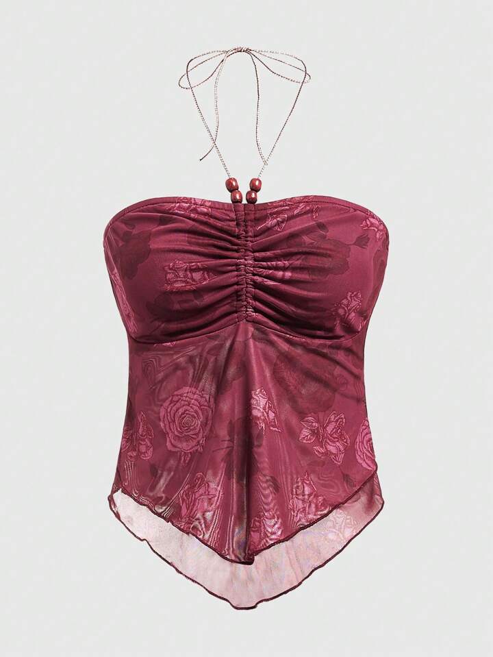 Top De Tanque Para Mujeres Con Cuello Halter De Cordón Y Diseño Floral