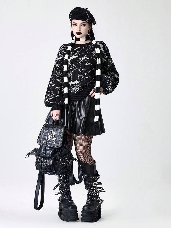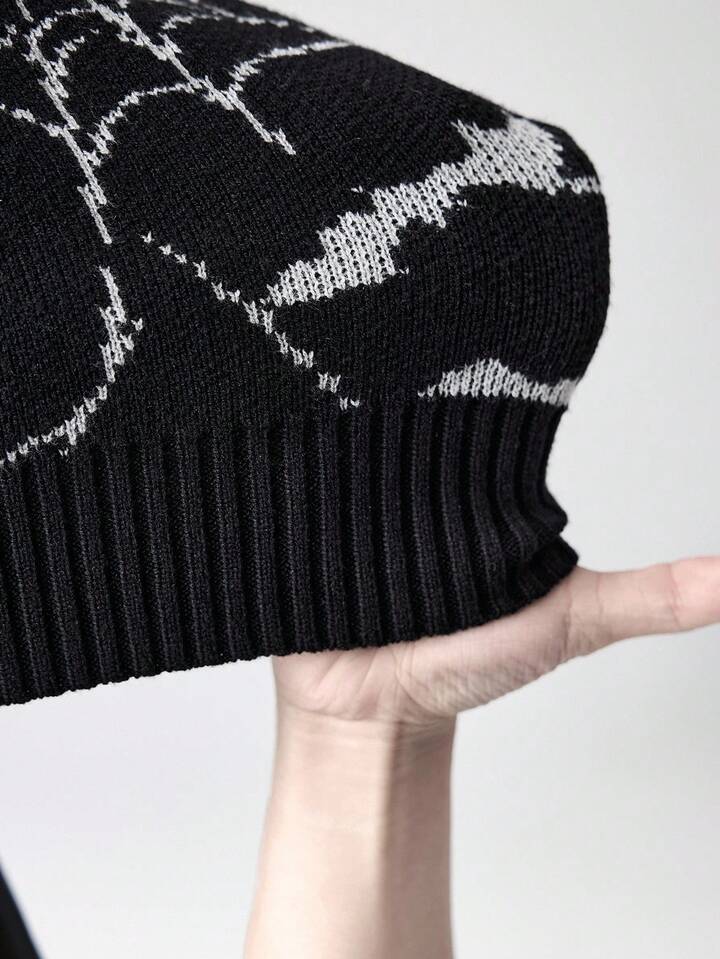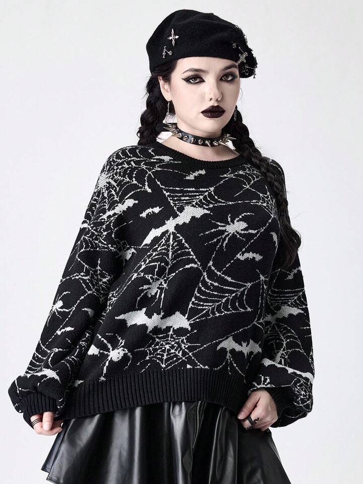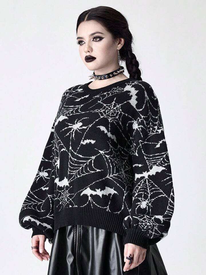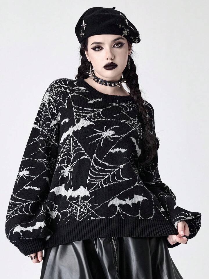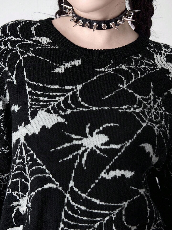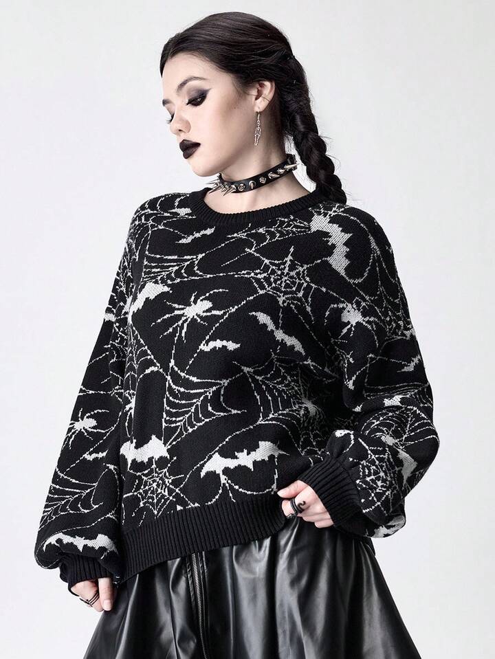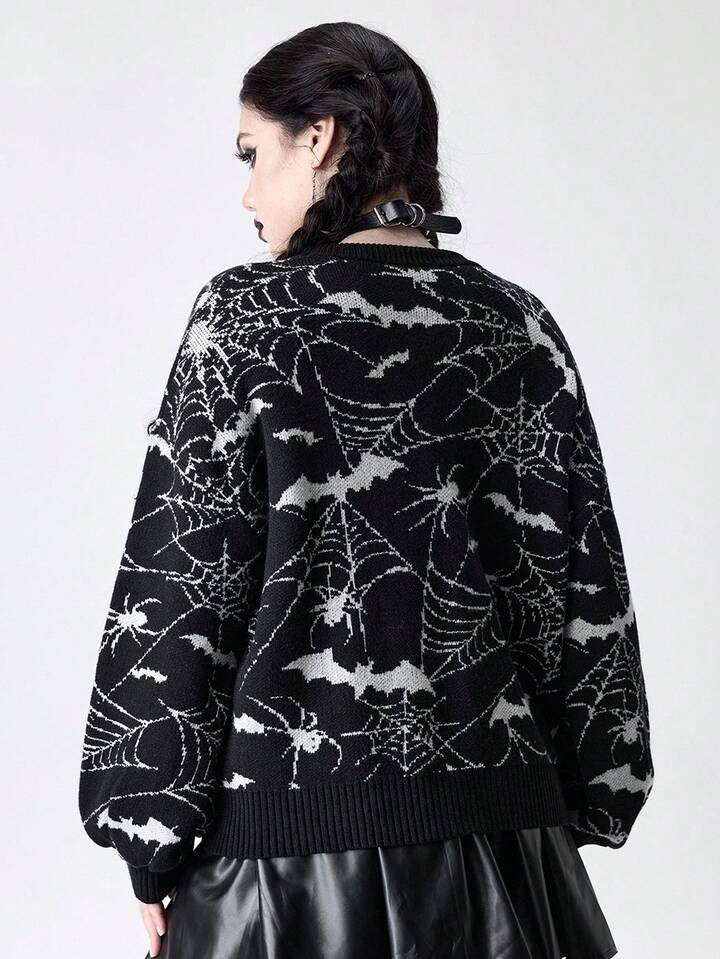 Goth Suéter de mujer con patrón jacquard de telaraña y murciélago gótico