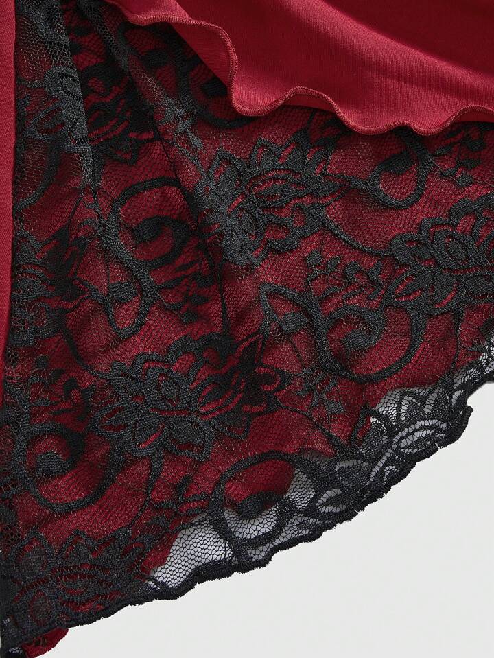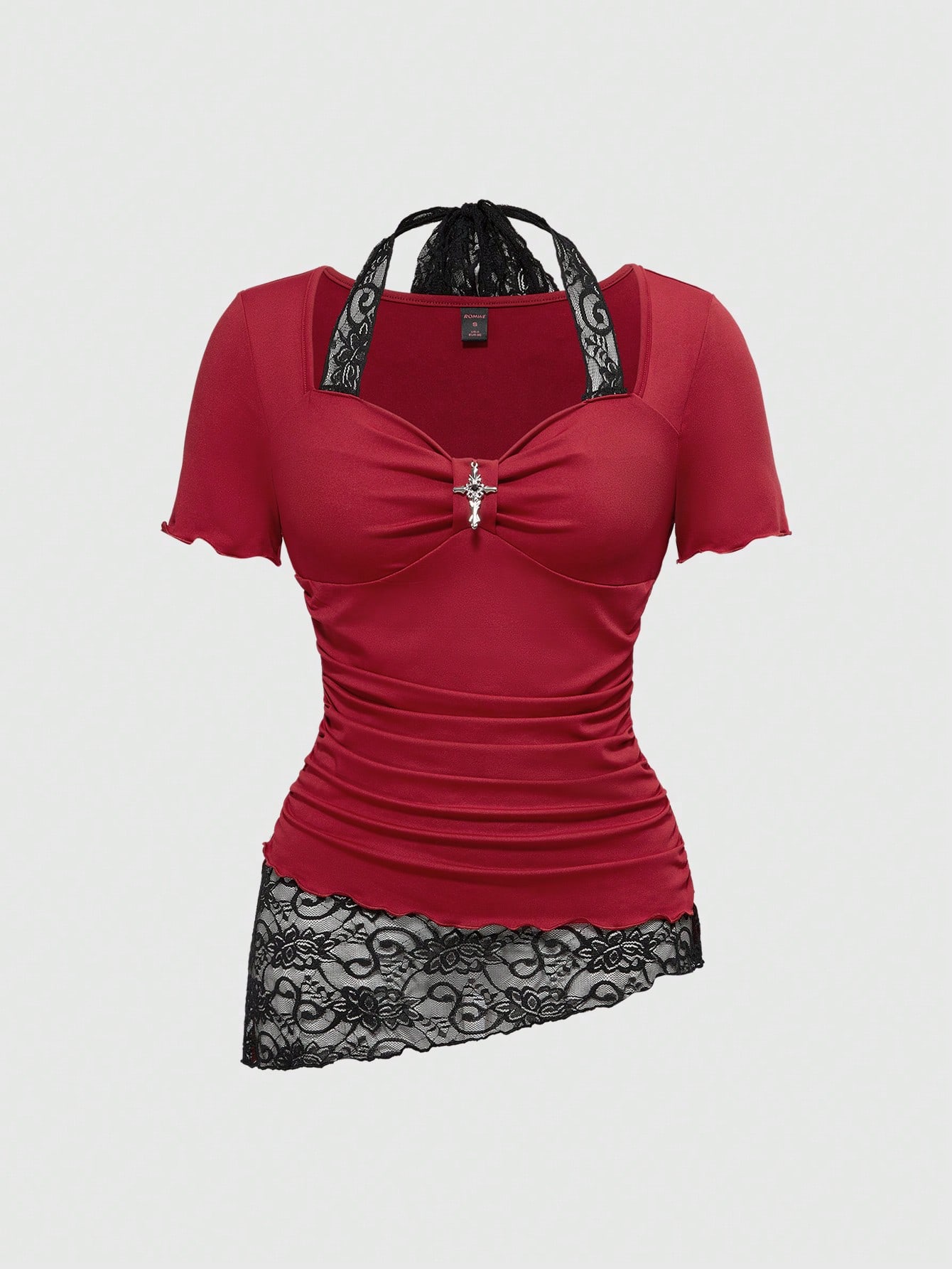 Camiseta de mujer de punto con parche, encaje asimétrico, dobladillo con encaje y lazo en la cintura