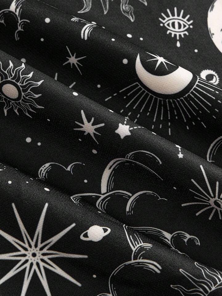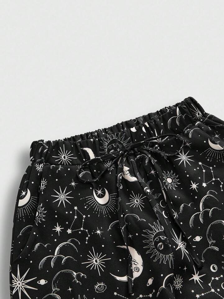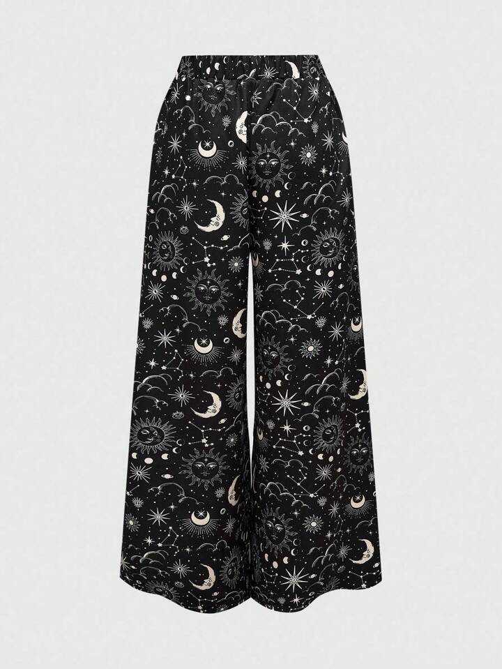 Pantalones de pierna ancha con estampado de luna creciente y estrellas en estilo hippie suelto, adecuados para vacaciones