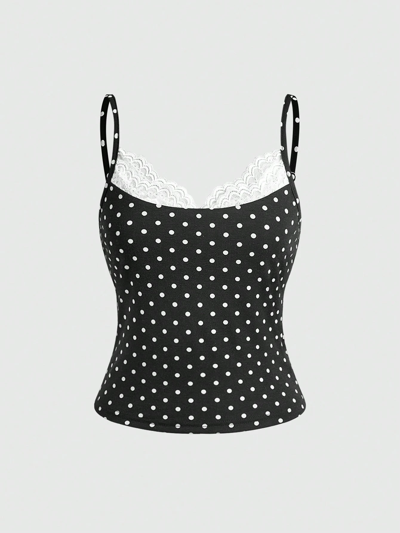 Camiseta de mujer con cuello en U, con detalles de encaje y estampado de lunares modernos