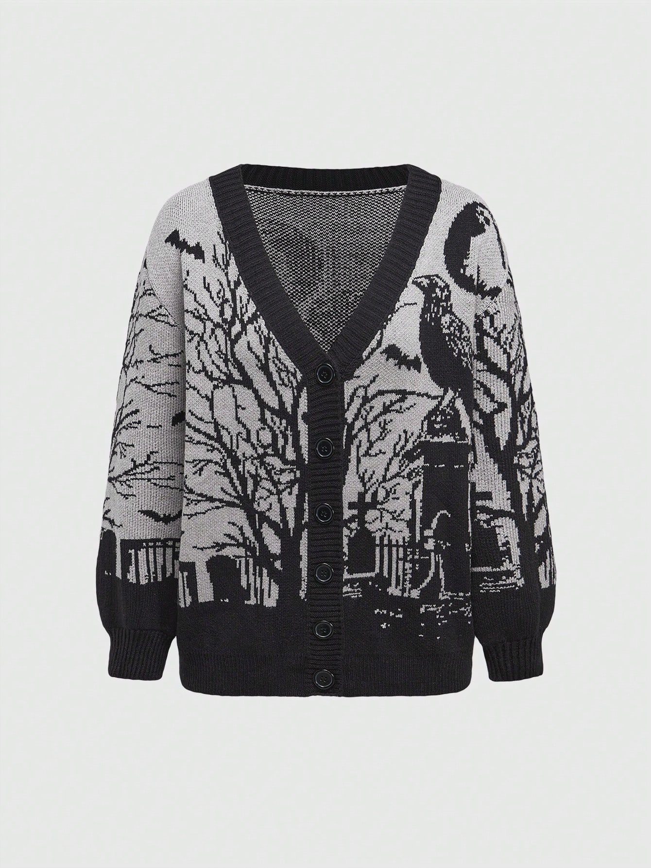 Goth Cárdigan con mangas de linterna gótico misterioso negro y gris con estampados de cuervo, luna y rama de árbol para mujer