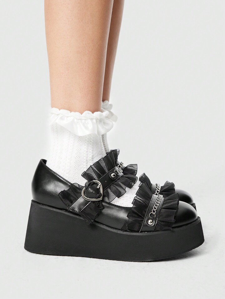 Goth Zapatos Mary Jane de plataforma y cuña de tacón grueso con decoración de corazón floral de red, estilo lindo y gótico en piel sintética (PU), para uso diario y campus, color negro