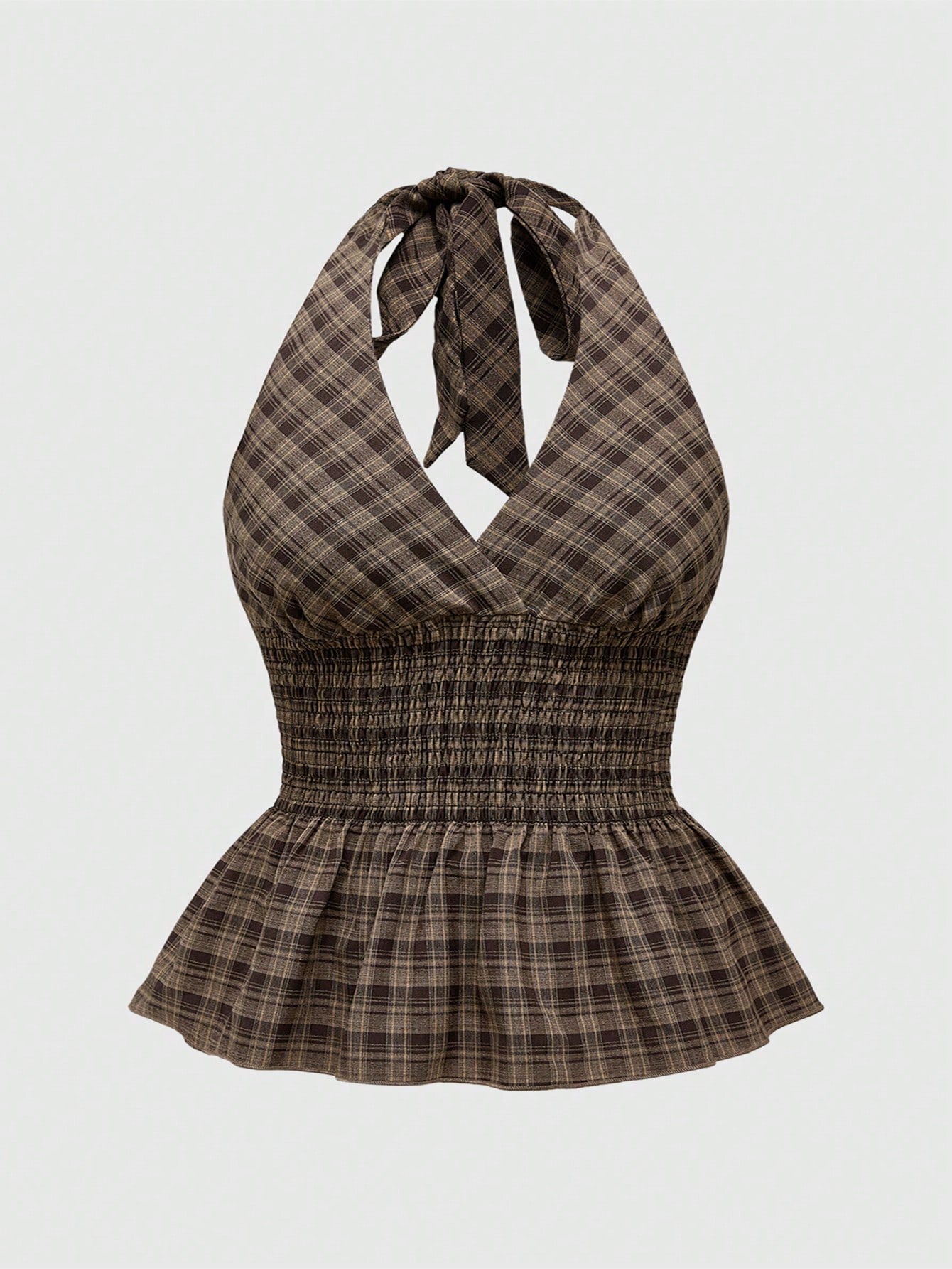 Top de tirantes con pliegues de cuello halter y detalle de cintura ajustada, estilo retro versátil y casual para mujer talla grande