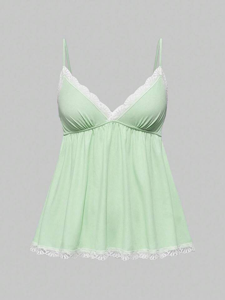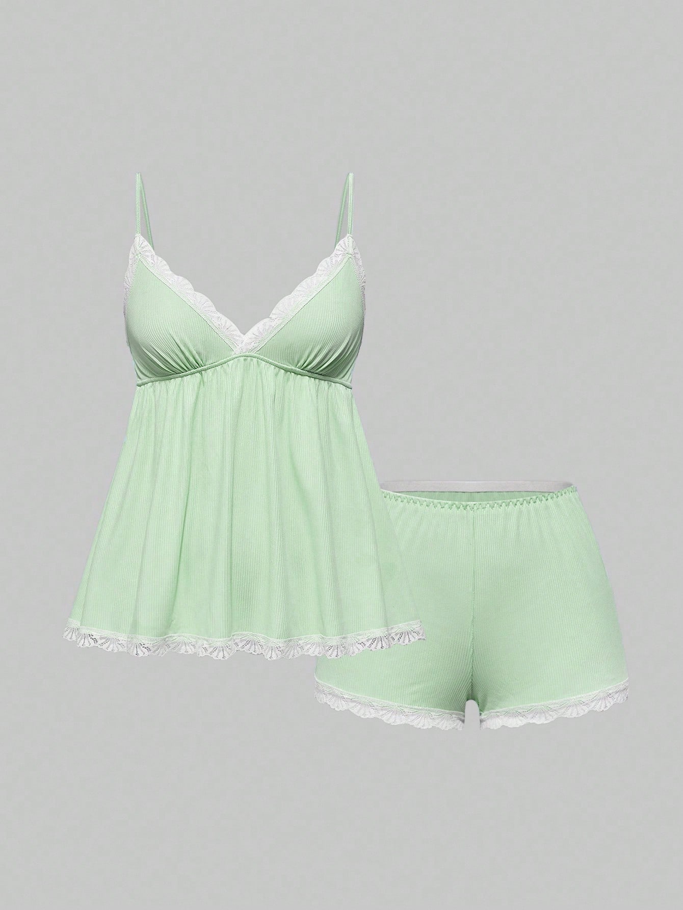 Conjunto de pijama de top de camisola con encaje de contraste y shorts para mujer