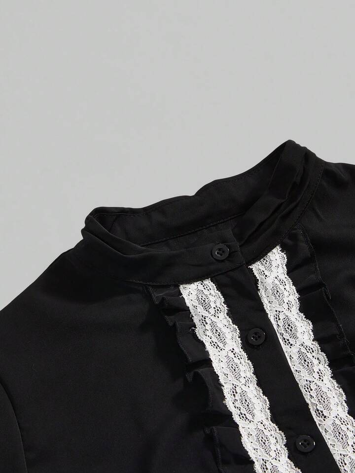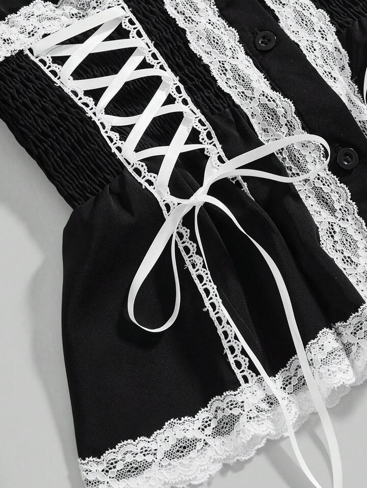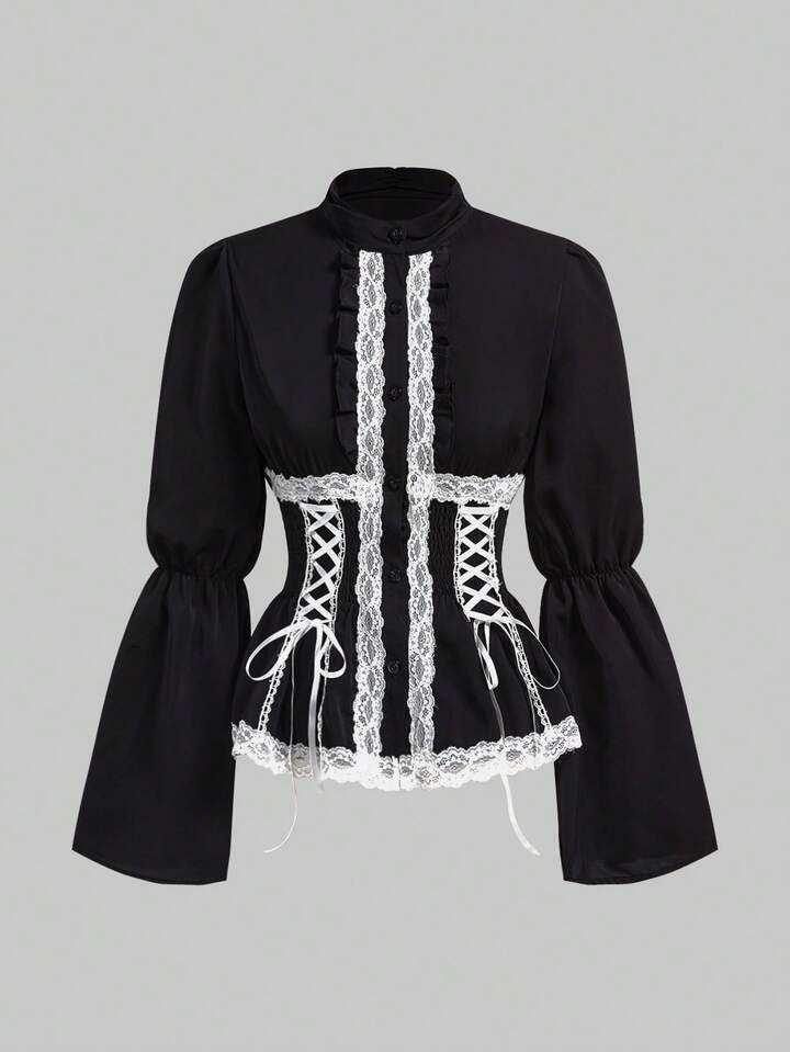 Goth Blusa ajustada con mangas acampanadas, volantes y encaje en el bajo, con efecto desgastado, de estilo gótico vintage para mujer