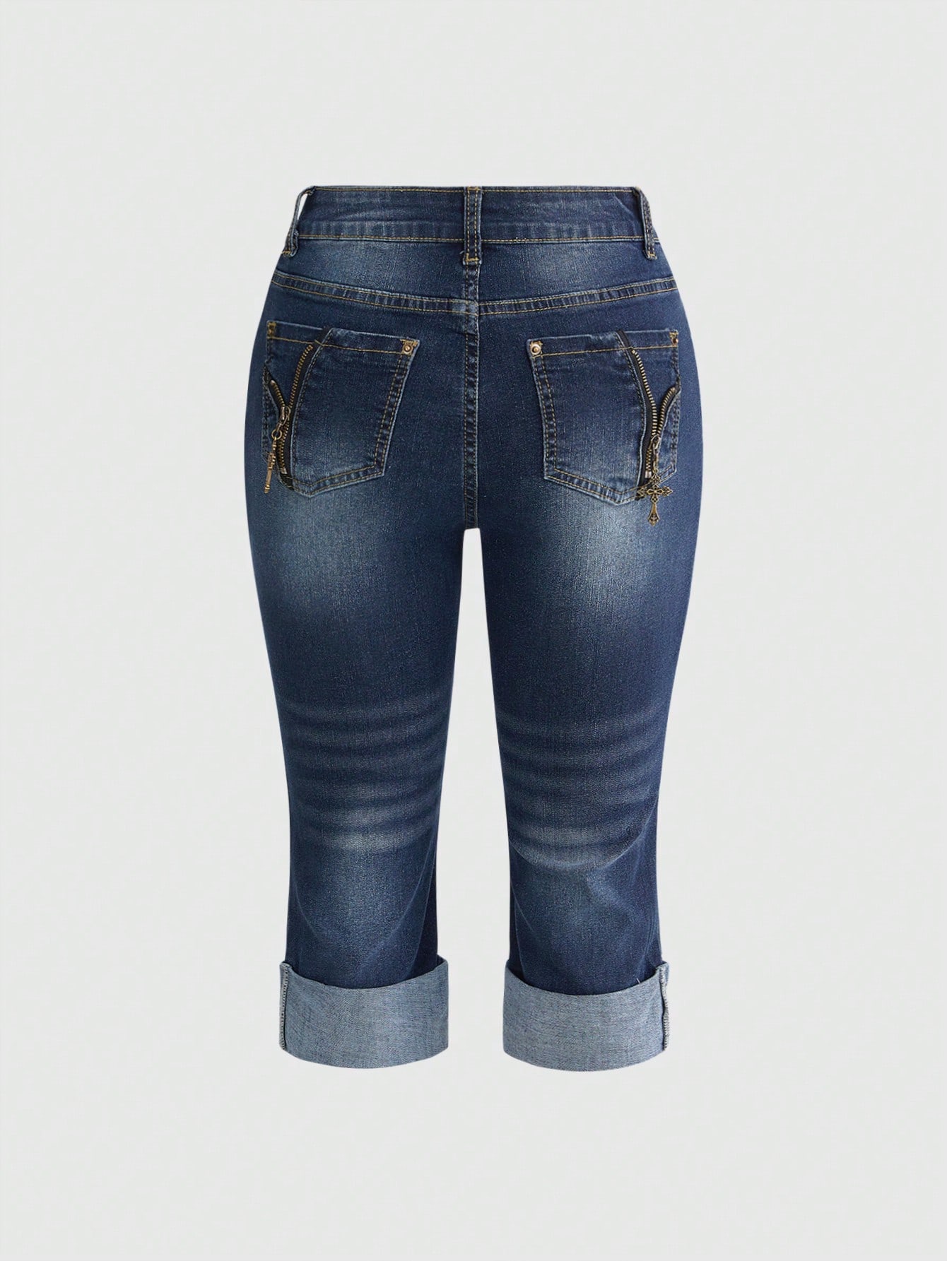 Pantalones de mezclilla de talle medio con estiramiento para mujer, estilo retro con bolsillos y decoración de cremallera, bajo con dobladillo, uso casual de verano, jeans ajustados de talle bajo para mujer
