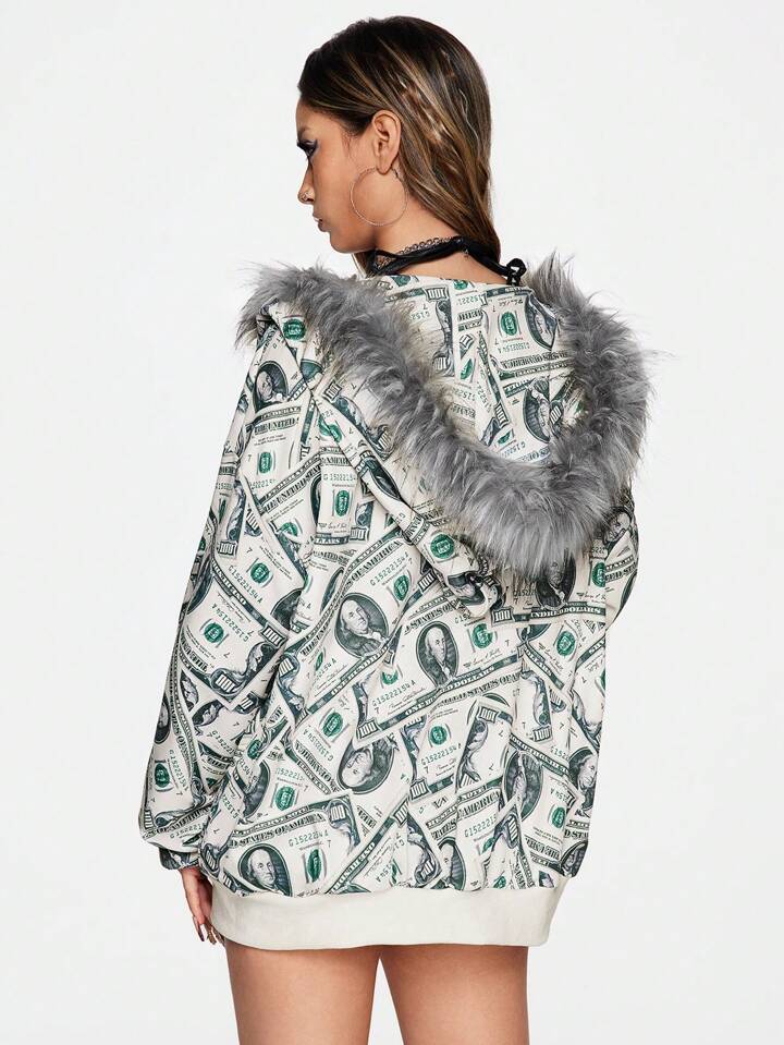 Gorra de peluche con estampado de billetes de dólar y sudadera holgada para mujer con estilo callejero Y2K de moda