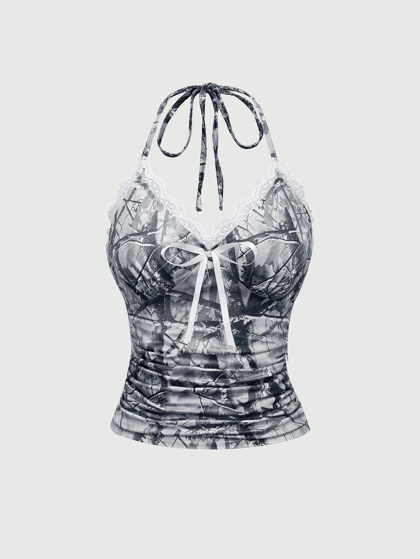 Top corto con estampado de camuflaje de hojas secas, escote de halter y ribete de encaje, estilo Y2K baddie