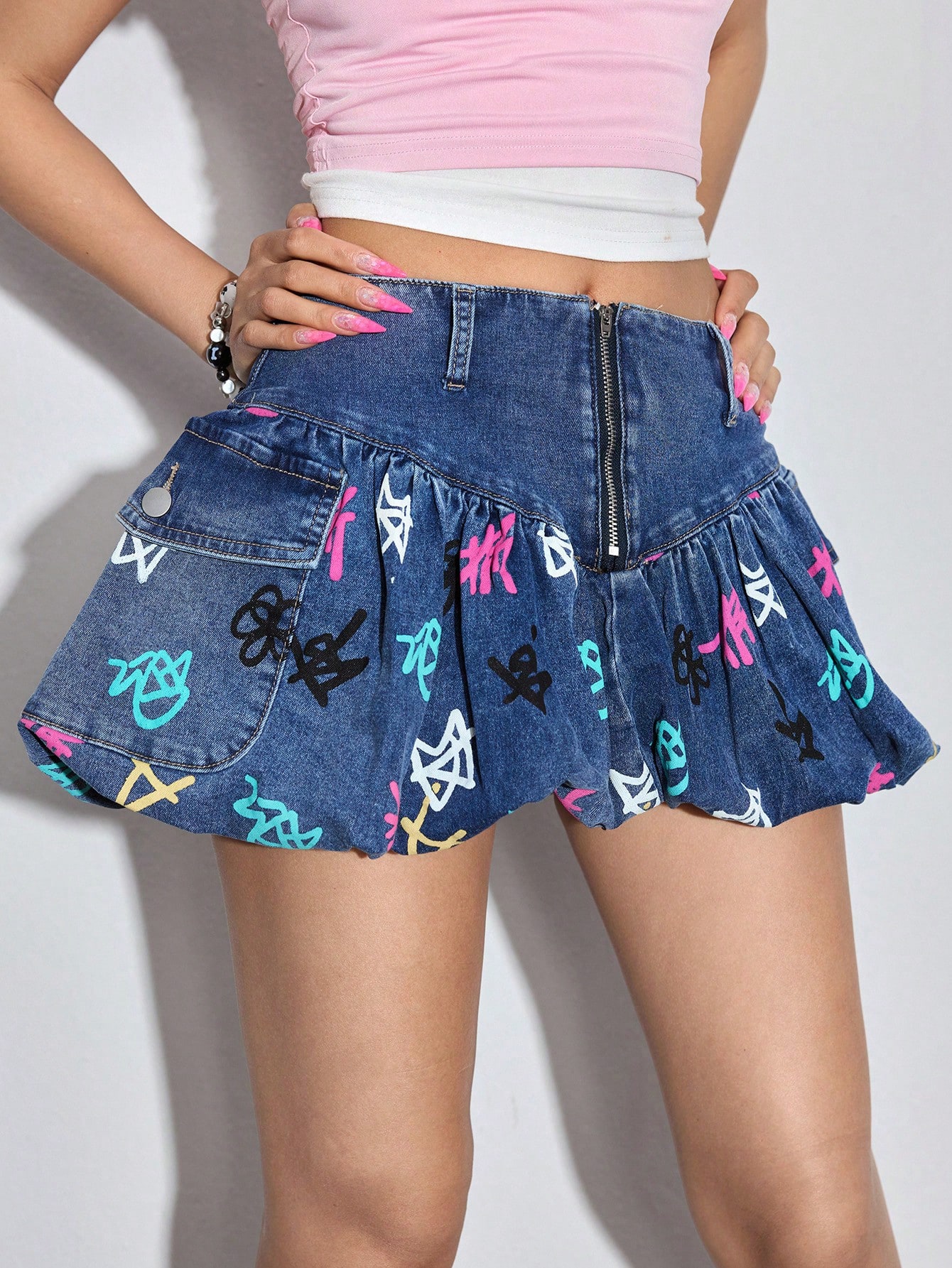 Y2K Minifalda de mezclilla con estampado de graffiti lindo y corazones, estilo chic para festivales de música, para mujeres