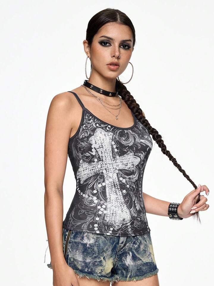 Goth Top de tirantes cruzados con cruz para mujer, estilo gótico retro Y2K