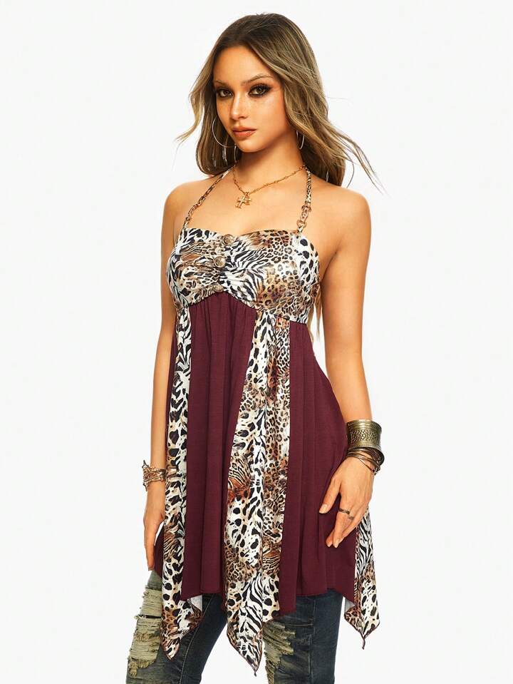 Vestido corto de mujer con estampado de leopardo vintage, efecto de empalme y dobladillo asimétrico, estilo Gyaru Y2K Harajuku