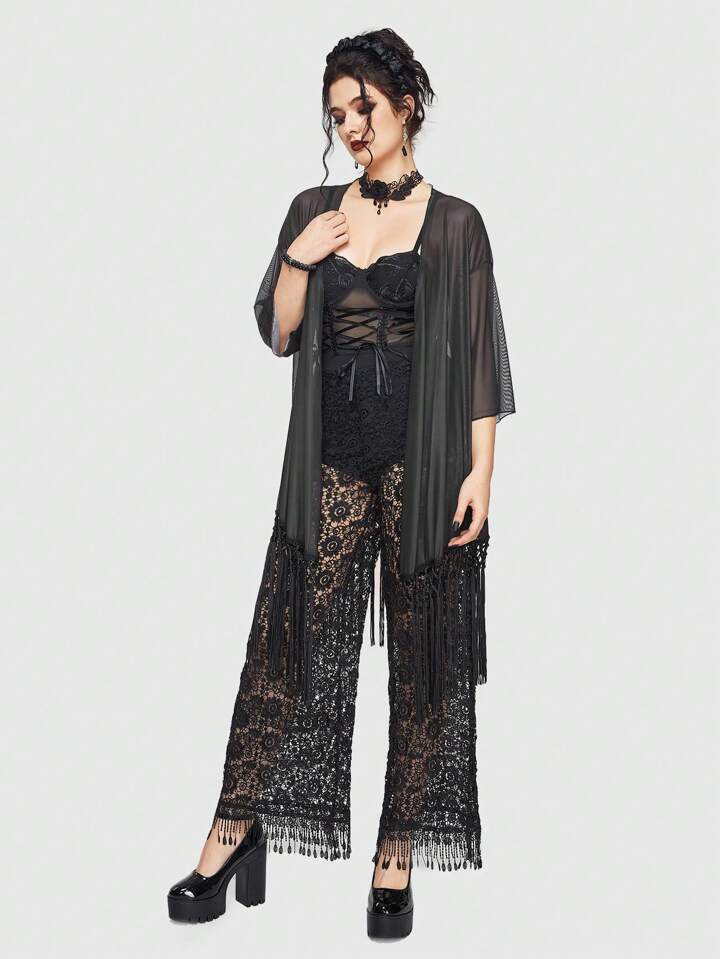 1 Pièce Kimono Pour Femmes À La Mode Gothique Avec Franges À Perspective Lâche, Noir