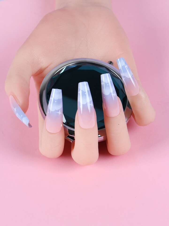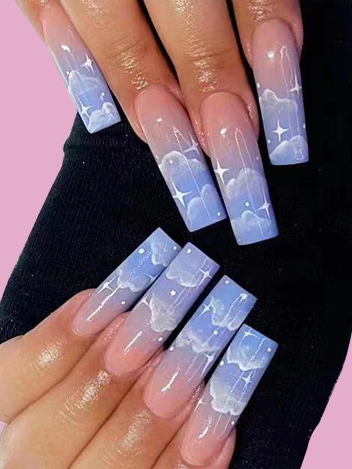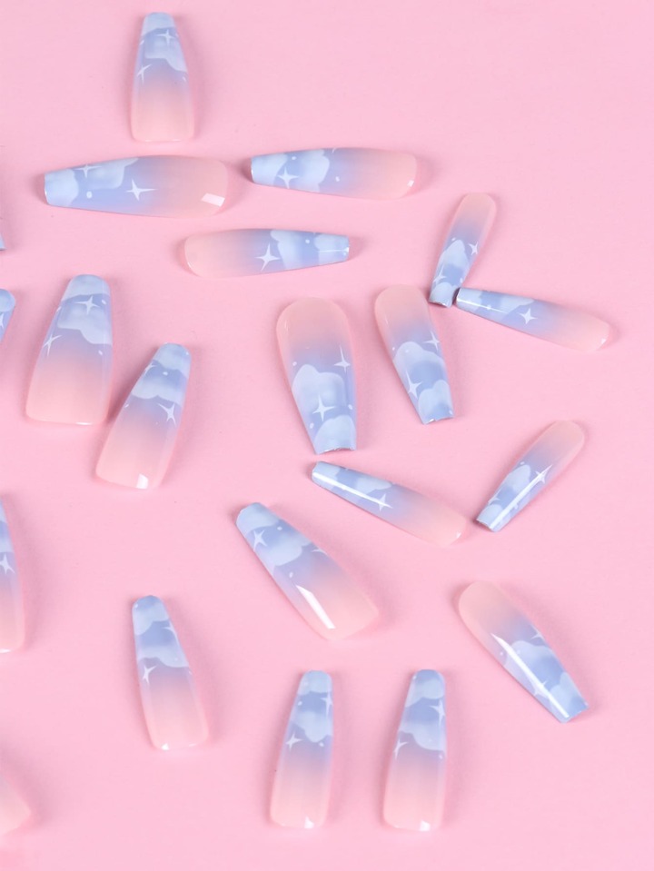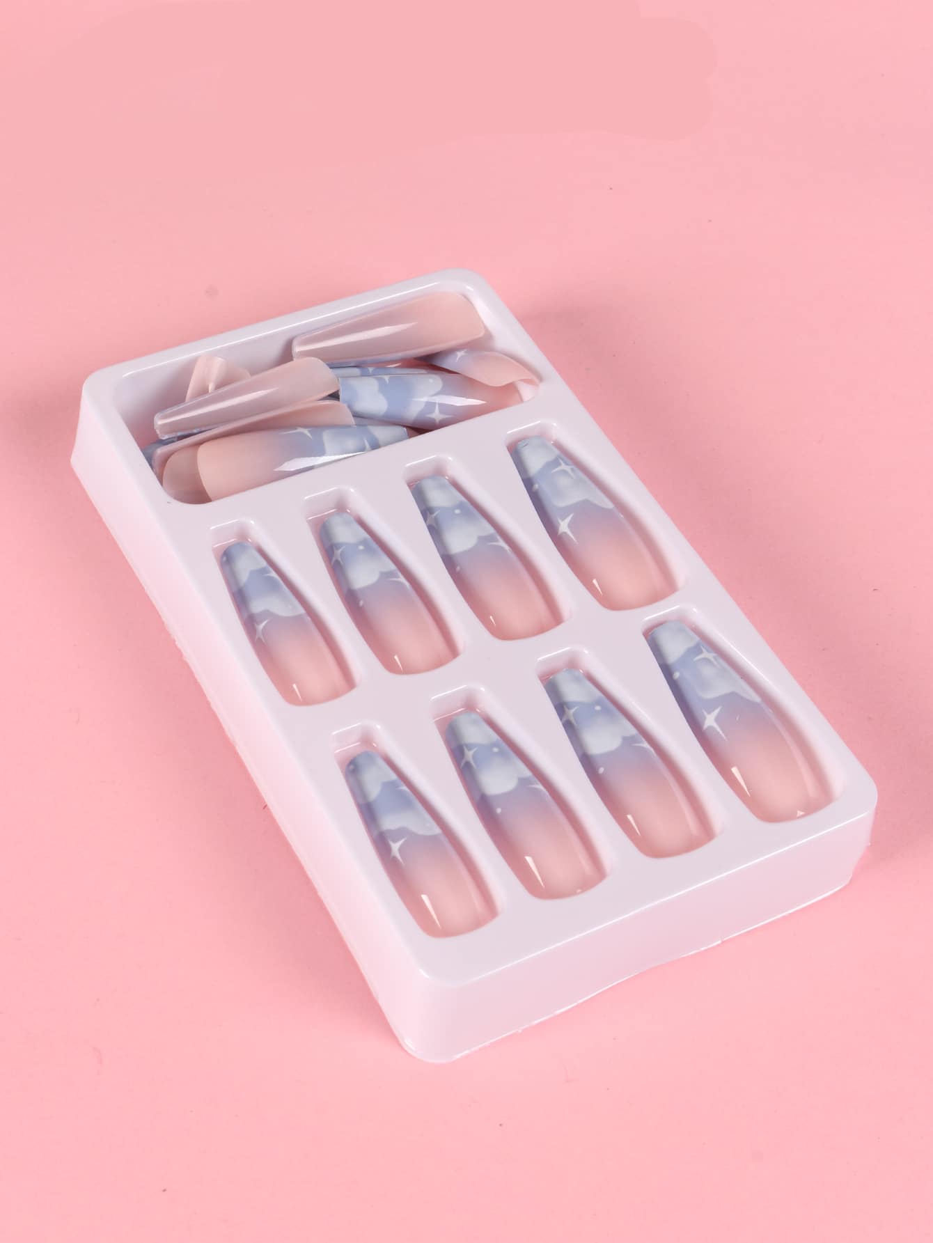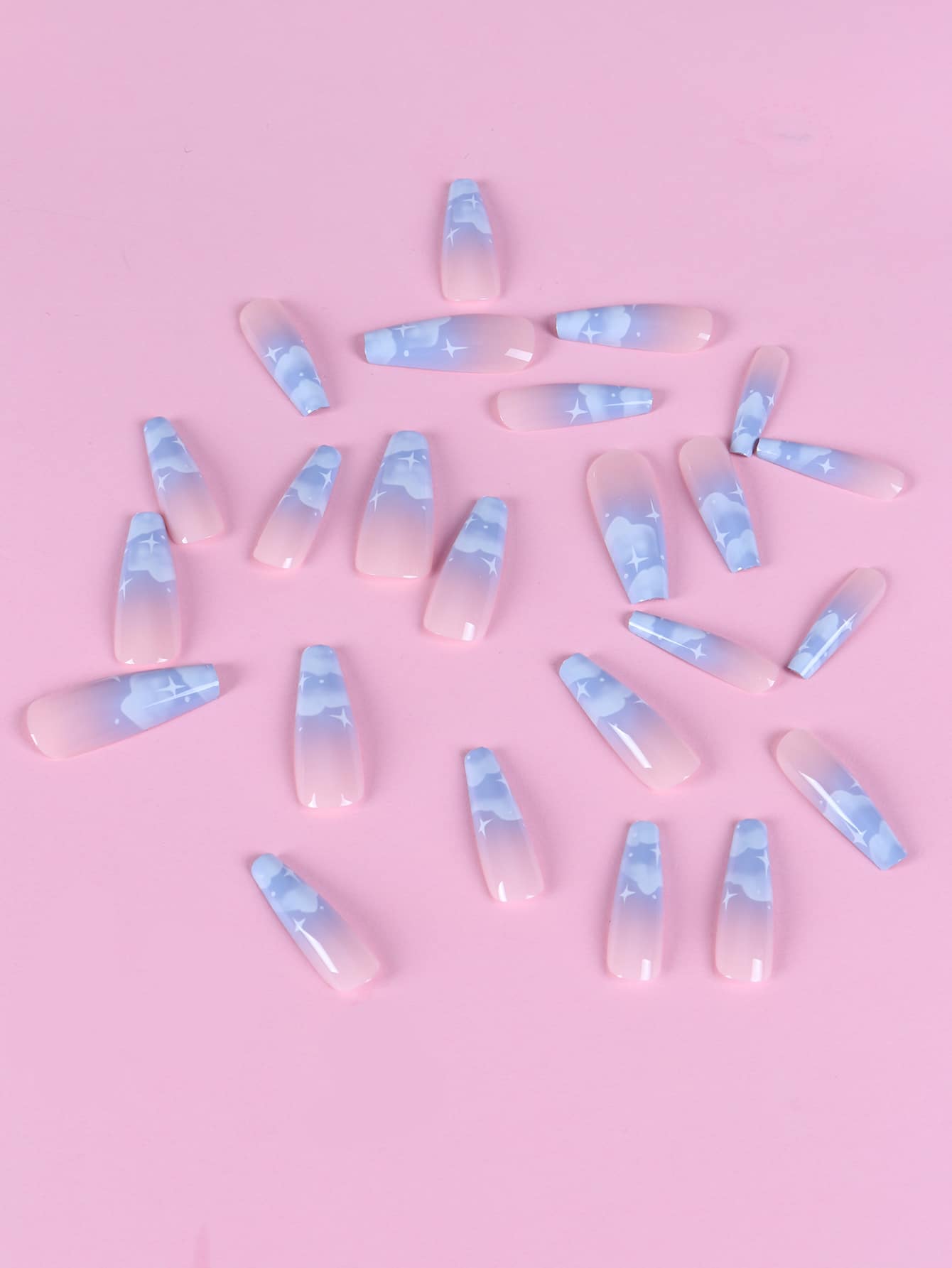 24 pièces long carré à motif de nuage Faux ongles & 1 feuille ruban