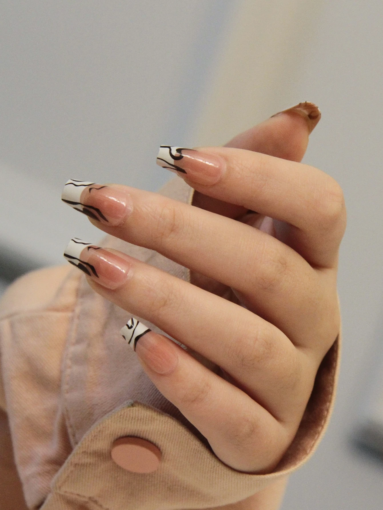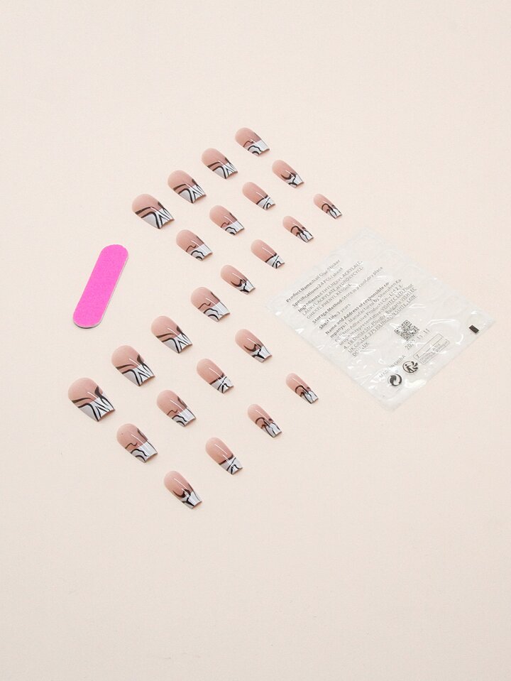 24 pièces Faux ongles court cercueil à rayures & 1 pièce Lime à ongles & 1 feuille Ruban