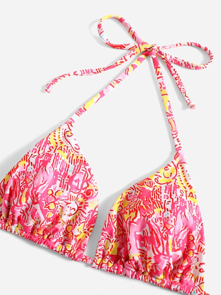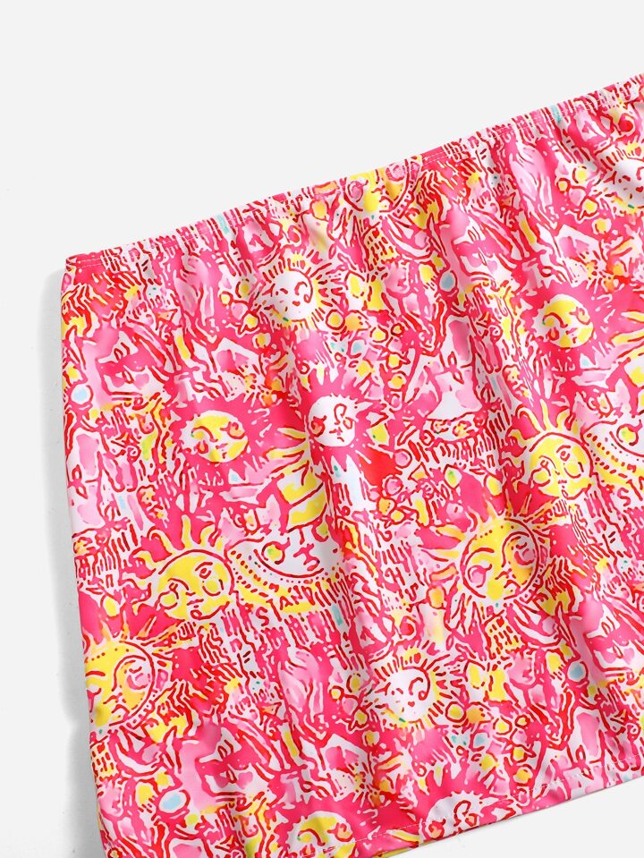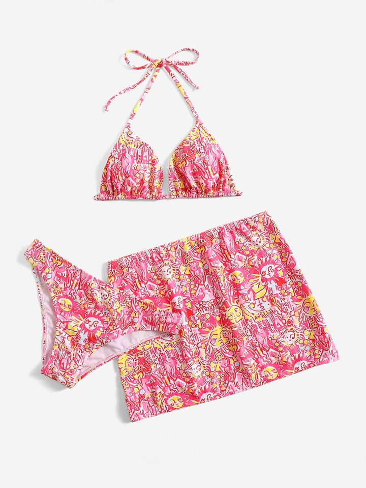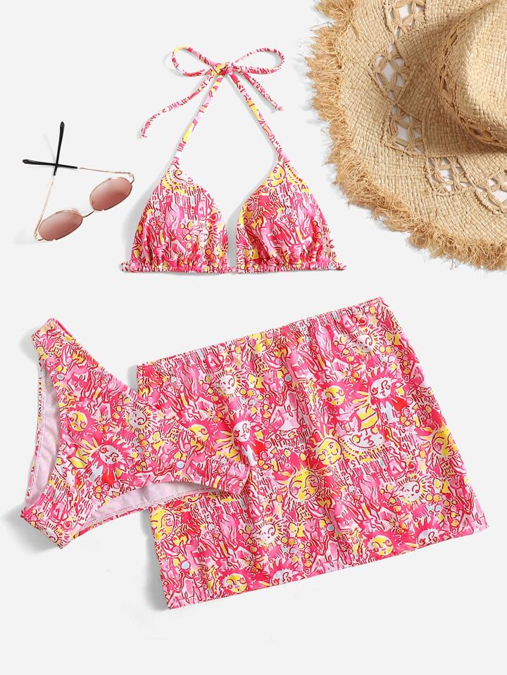 3 ensembles Bikini avec col en ras-du-cou imprimé intégral et jupe de plage