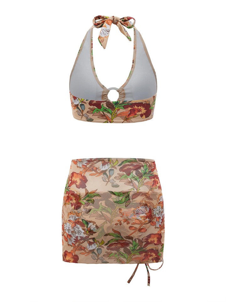Ensemble bikini d'été pour plage avec 3 packs Anneau imprimé de plantes et jupe de plage