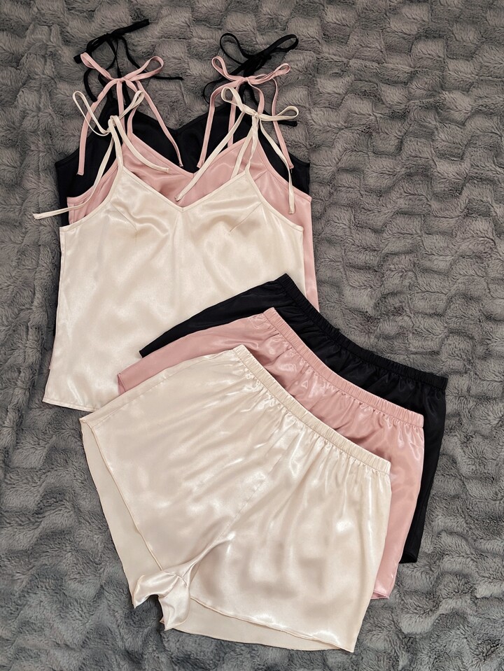 3 ensembles Débardeur en satin à épaules nouées et short pyjama / ensemble de pyjama