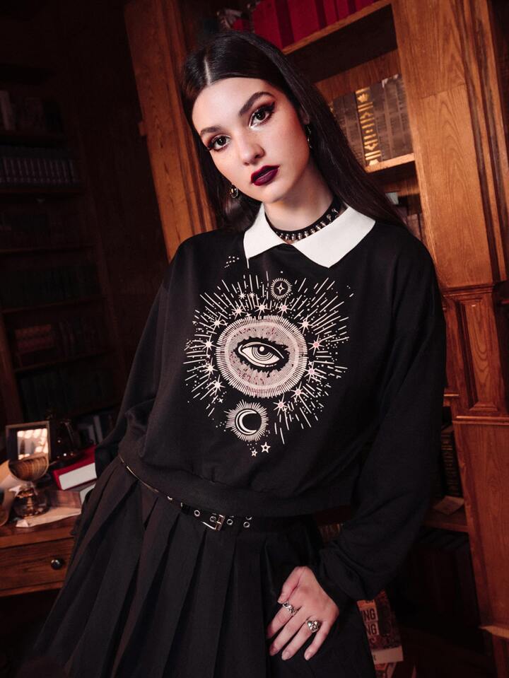 Dark Academia Sweat-shirt œil & lune à col contrastant