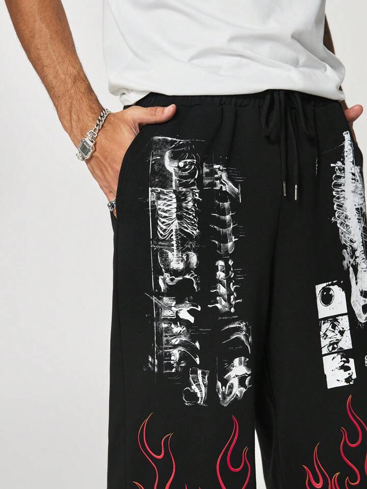 Academia Pantalon à jambe large pour homme, coupe ample, design imprimé de lettres et de crânes avec taille à cordon