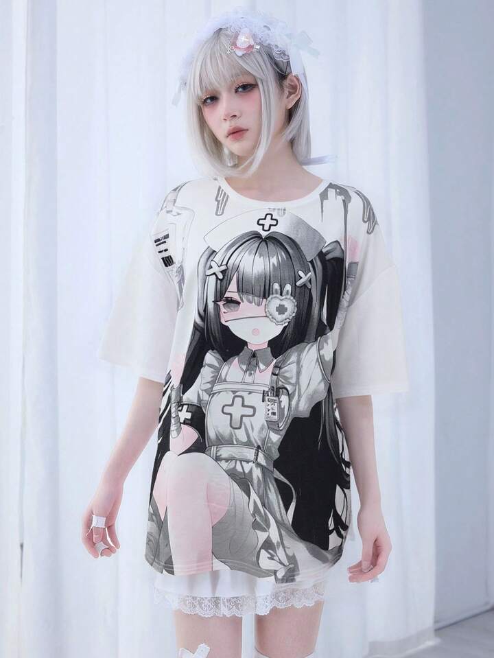 T-shirt à manches courtes col rond ample rose avec motif de fille yandere de dessin animé anime