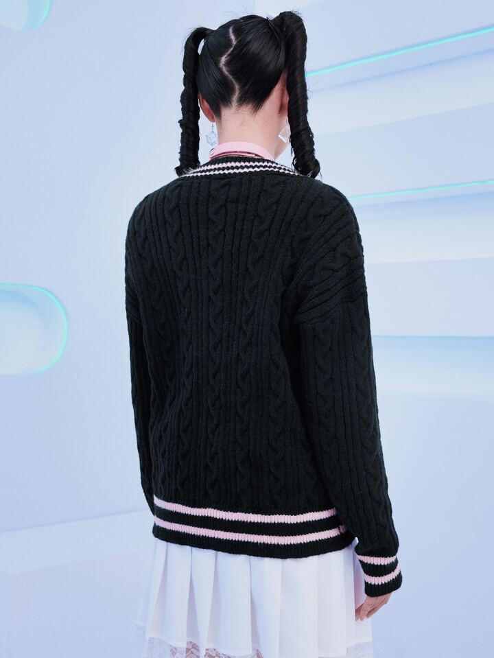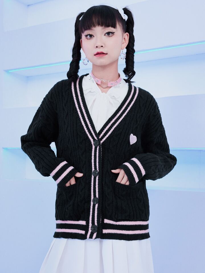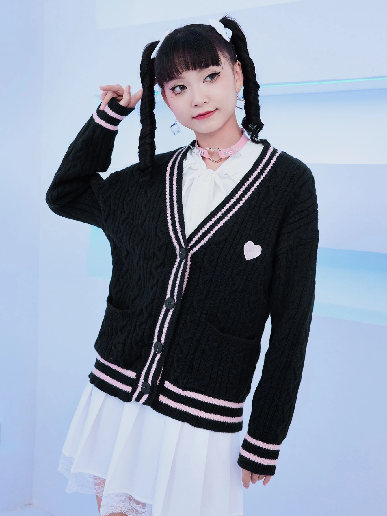 Anime Cardigan en tricot torsadé à motif cœur à ourlet à rayures