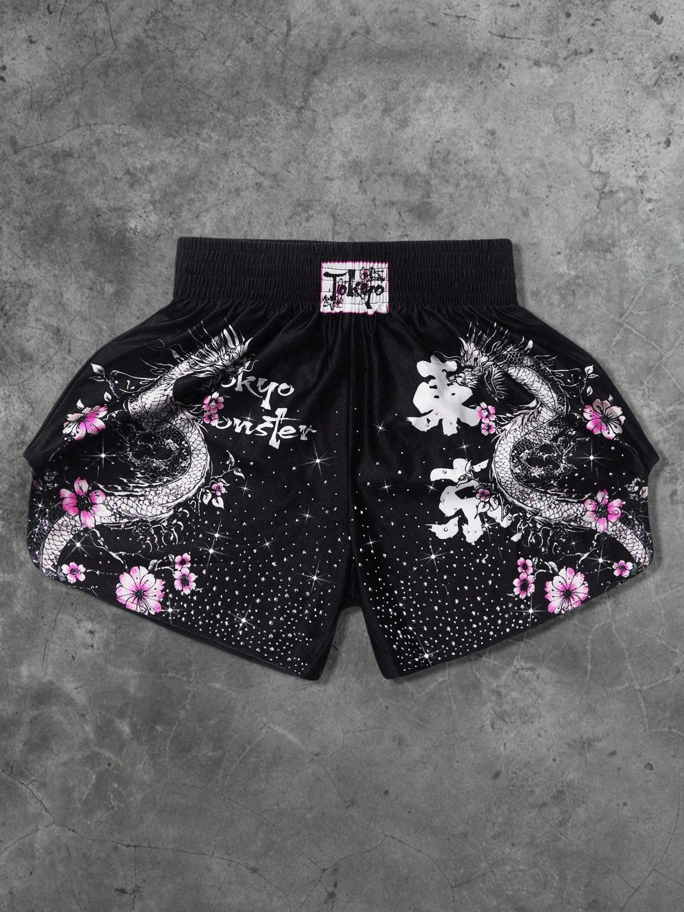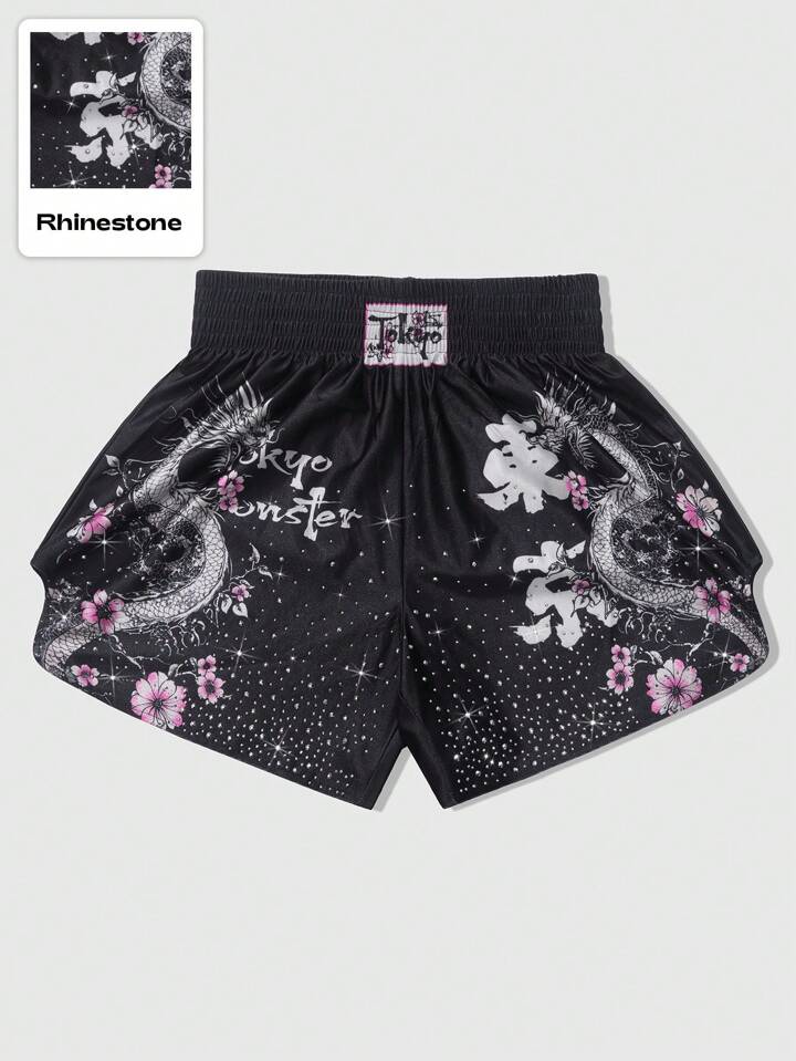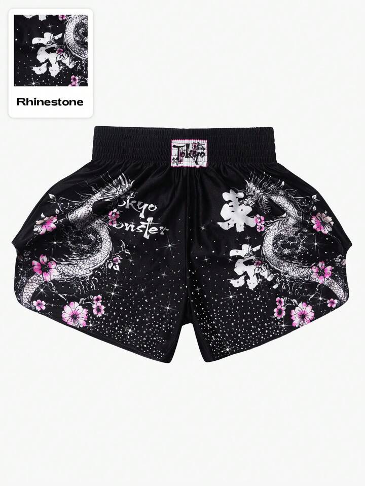 Anime Short de boxe pour hommes avec design américain de rue, décoré de strass brillants et d'un délicat motif floral rose sur le corps du dragon