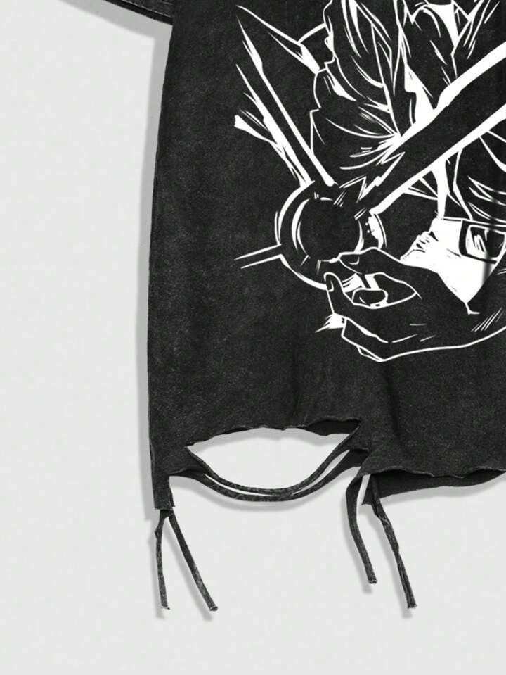 Anime T-shirt décontracté à manches courtes col rond distressed avec graphique portrait pour hommes, été