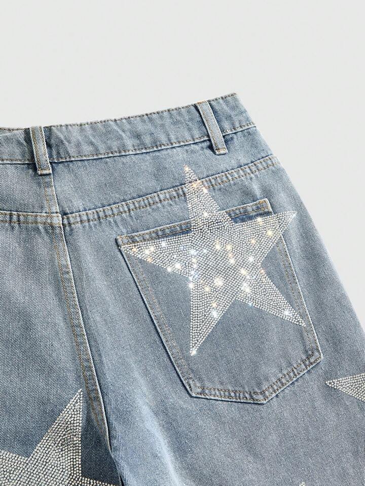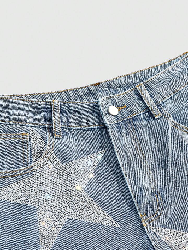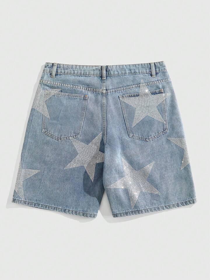 Anime Short en jean décontracté pour homme avec bouton orné de strass en forme d'étoile à cinq branches