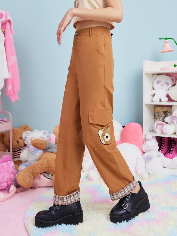 Anime Pantalon cargo à carreaux à applique ours dessin animé
