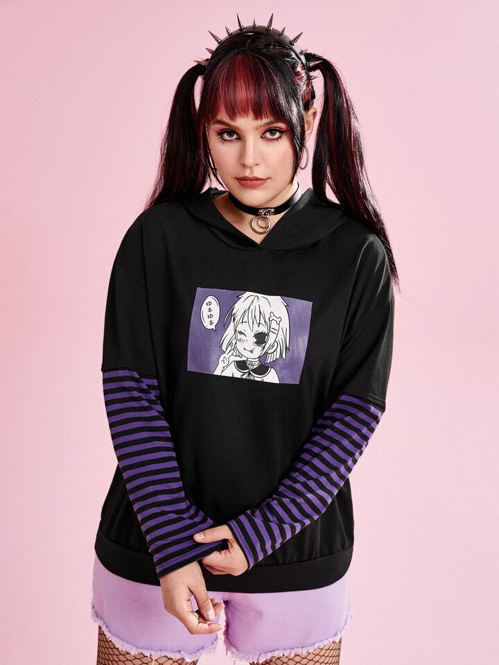Anime Sweat-shirt à capuche à rayures à imprimé figure