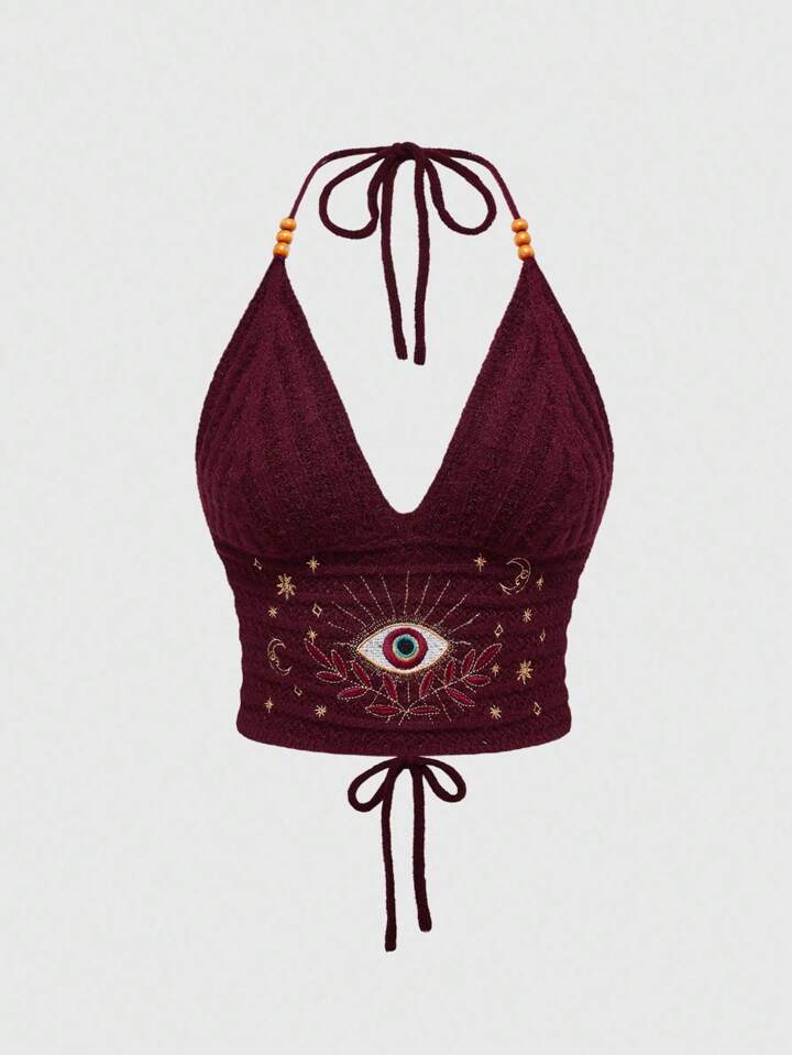 Retour à l'école Femmes Style bohème d'été "Vacances hippies" Top tricoté avec broderie d'yeux, de lune et d'étoiles, Top à col ras-du-cou perlé pour femmes