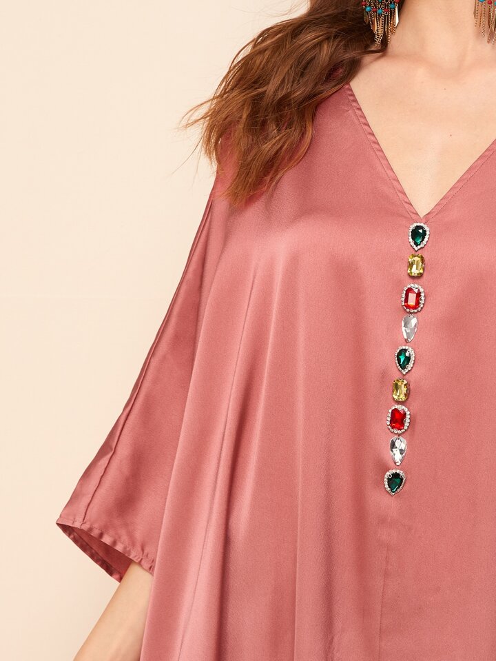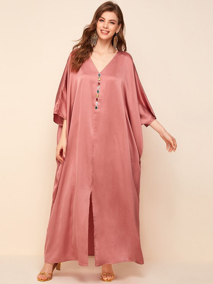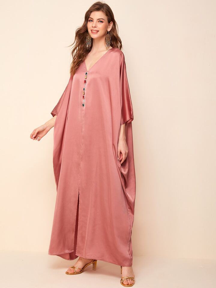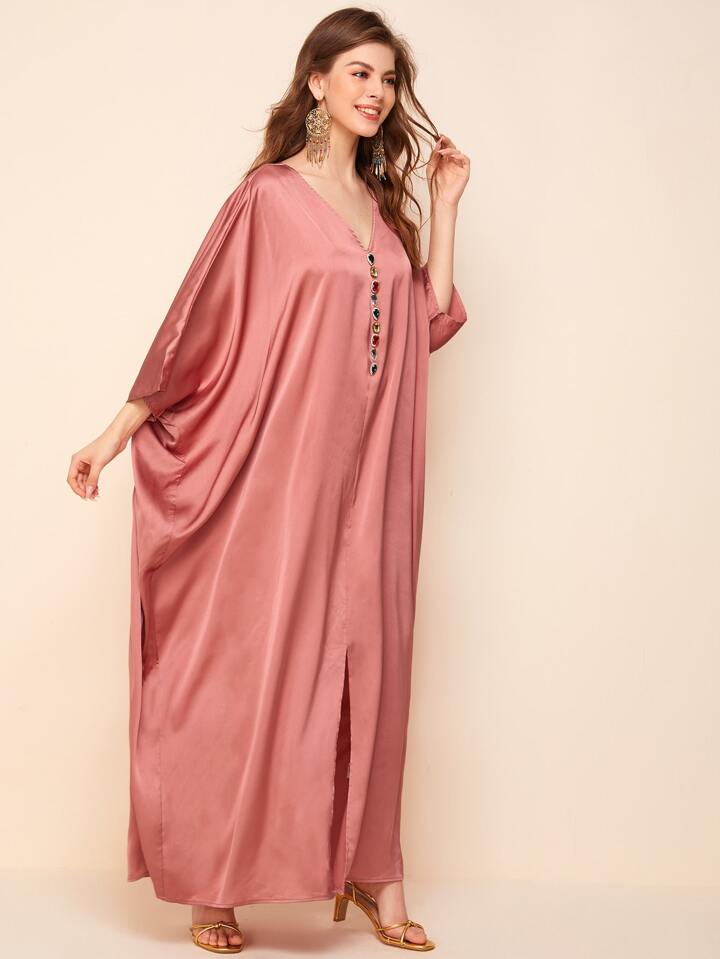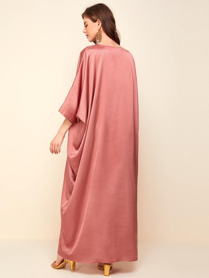 Robe cocon en satin à ourlet fendu avec strass et manches chauve-souris
