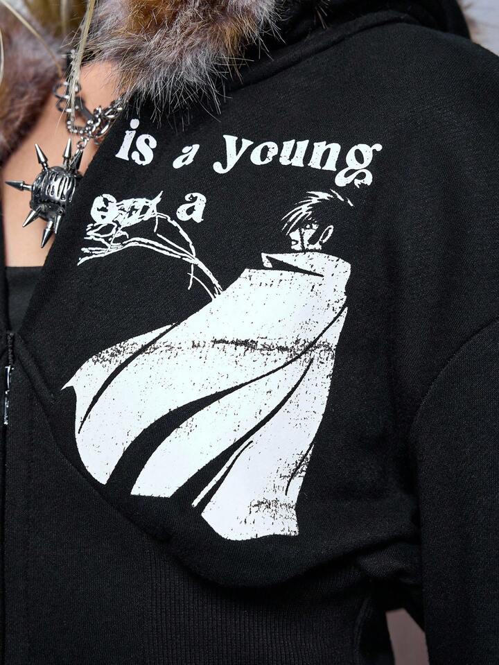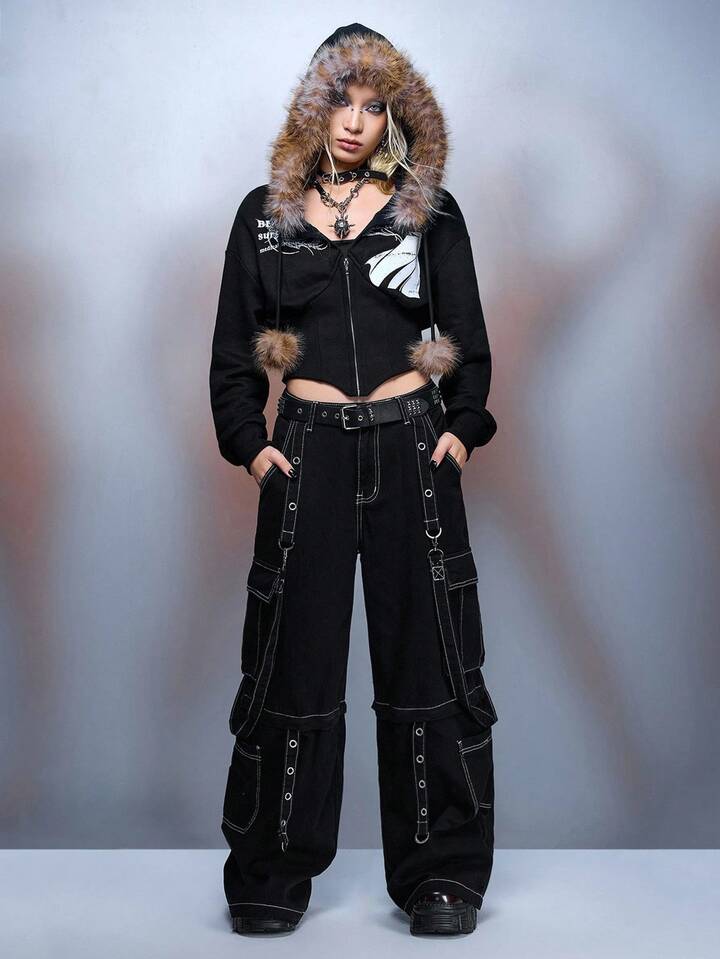 Black Jack X ROMWE Sweat-shirt-shirt à capuche à manches longues avec fermeture éclair, graphique de lettres et fausse fourrure contrastée pour femmes