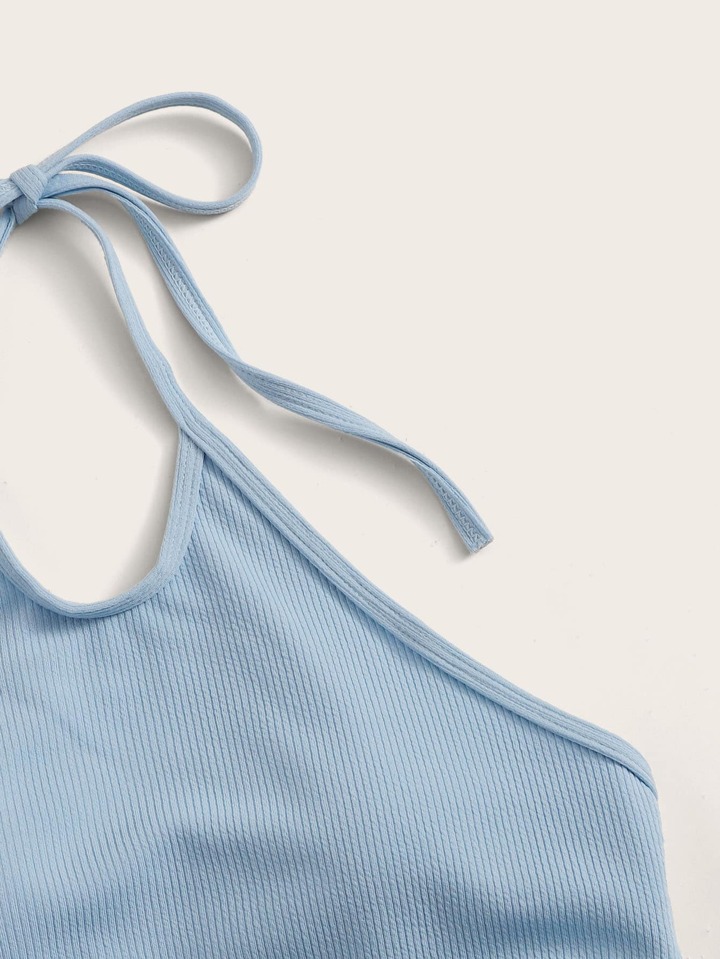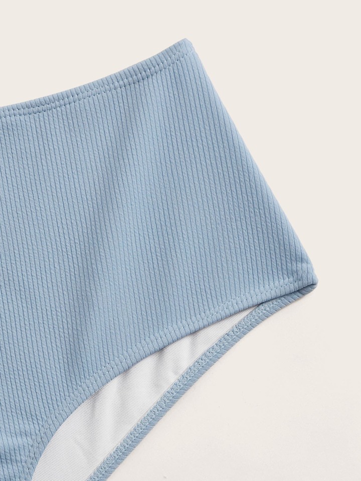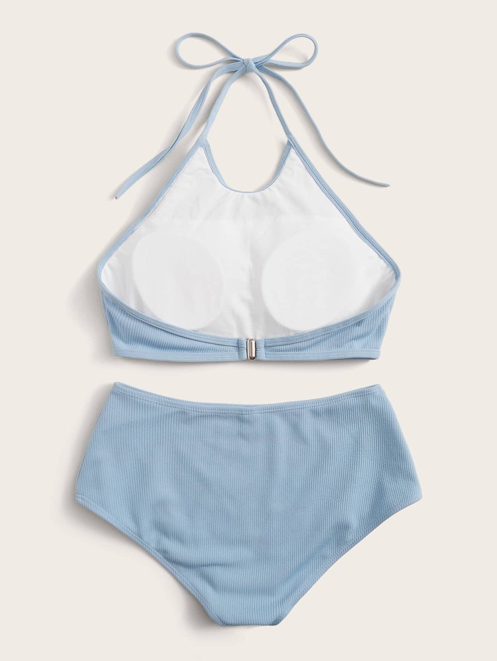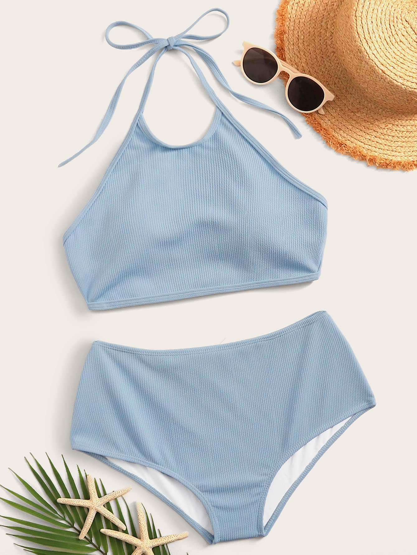 Ensemble de bikini bleu à taille haute avec col ras-du-cou pour plage estivale