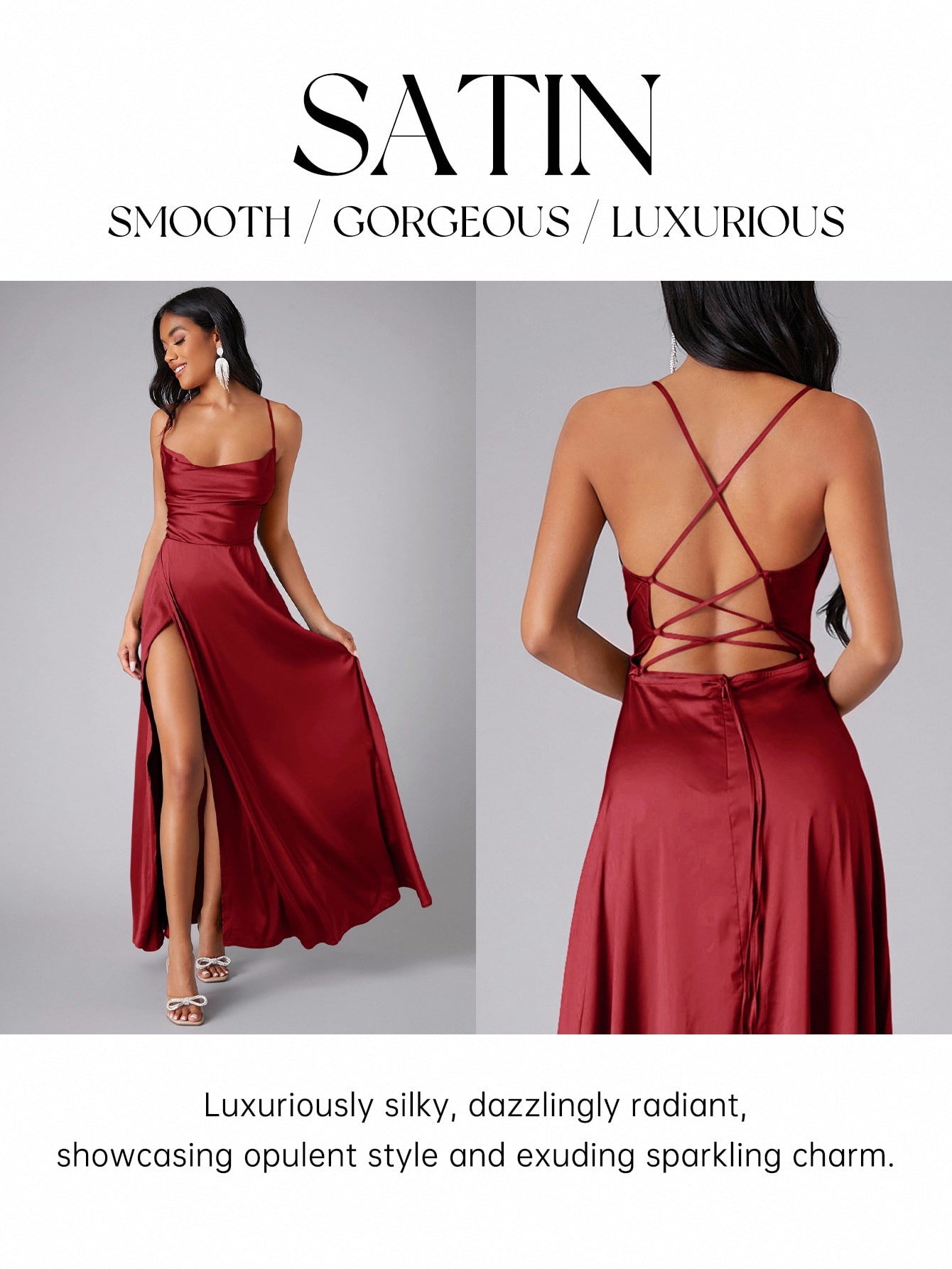 Robe de demoiselle d'honneur élégante en satin bordeaux avec col cranoisé croisé à l'avant, dos nu, bretelles basses et découpe au niveau des jambes