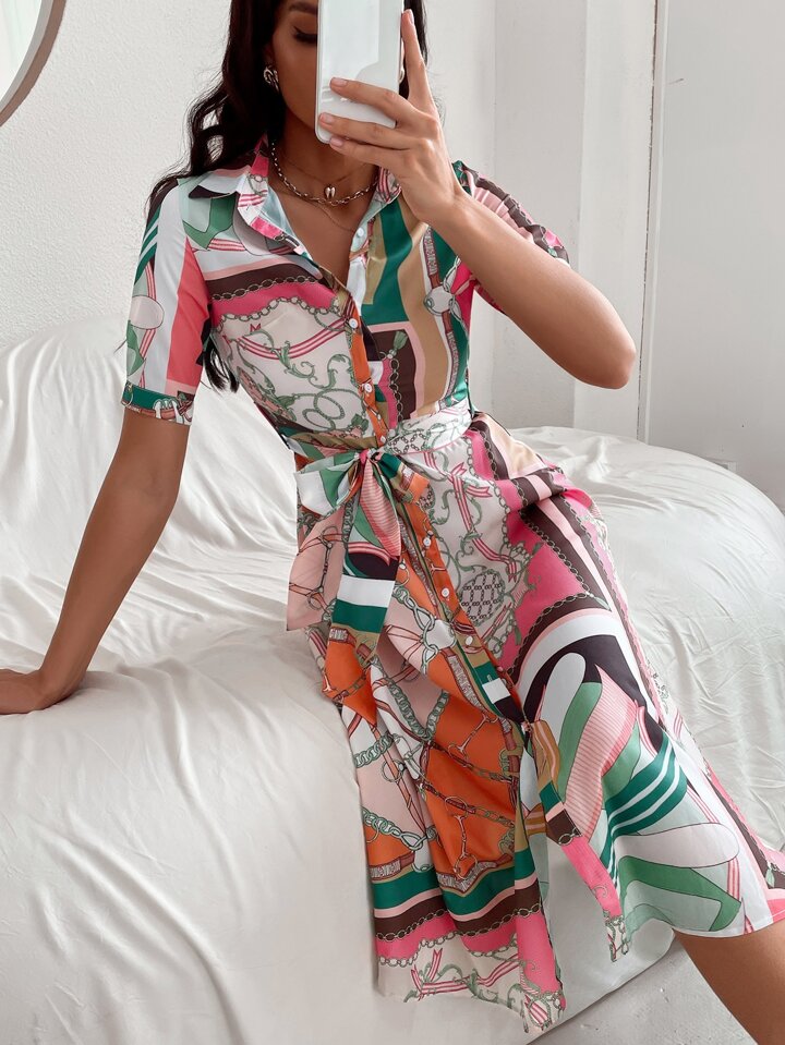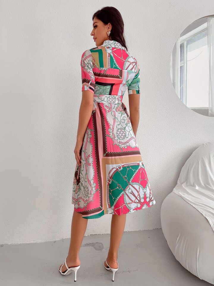 Robe chemise à imprimé chaîne ceinturée à bouton