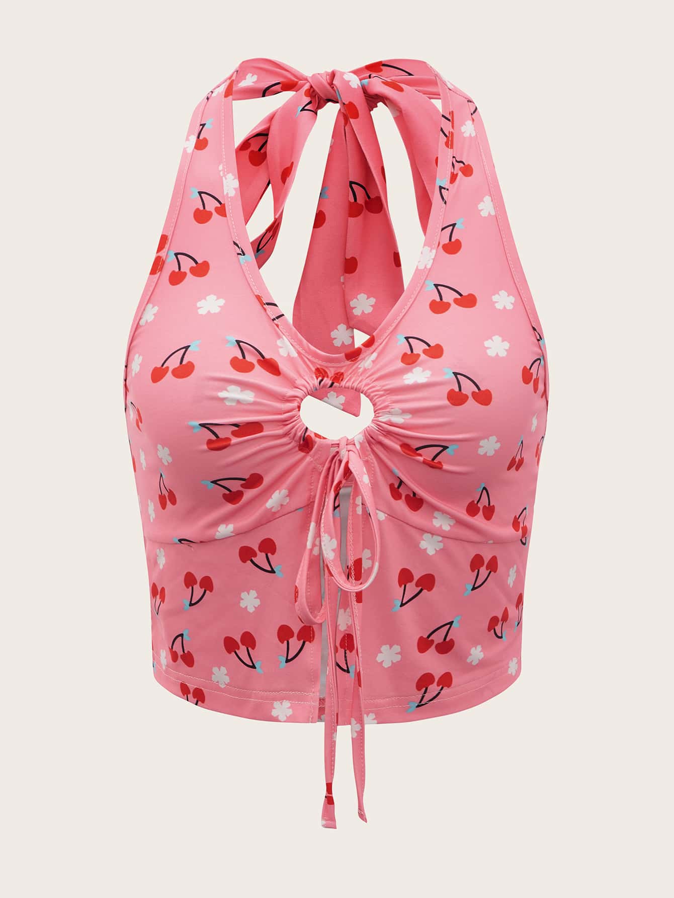 Top ras-du-cou à imprimé cerise découpe à nœud
