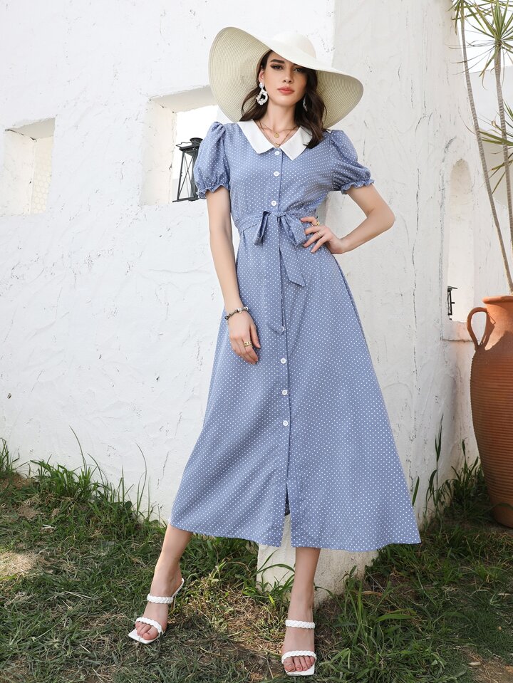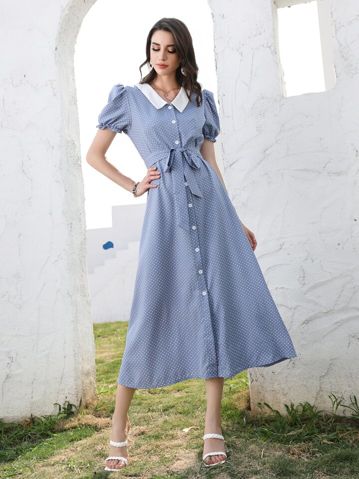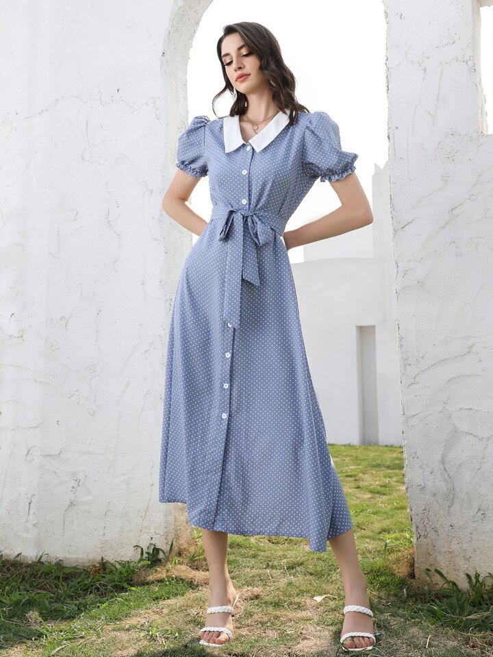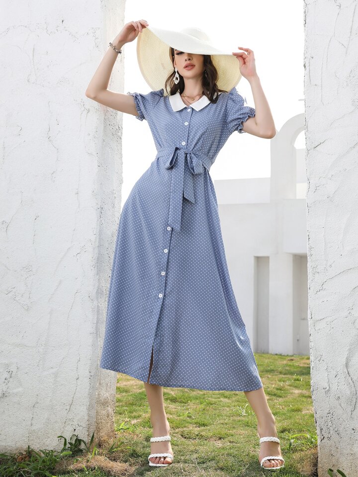 Robe chemise ceinturée à pois