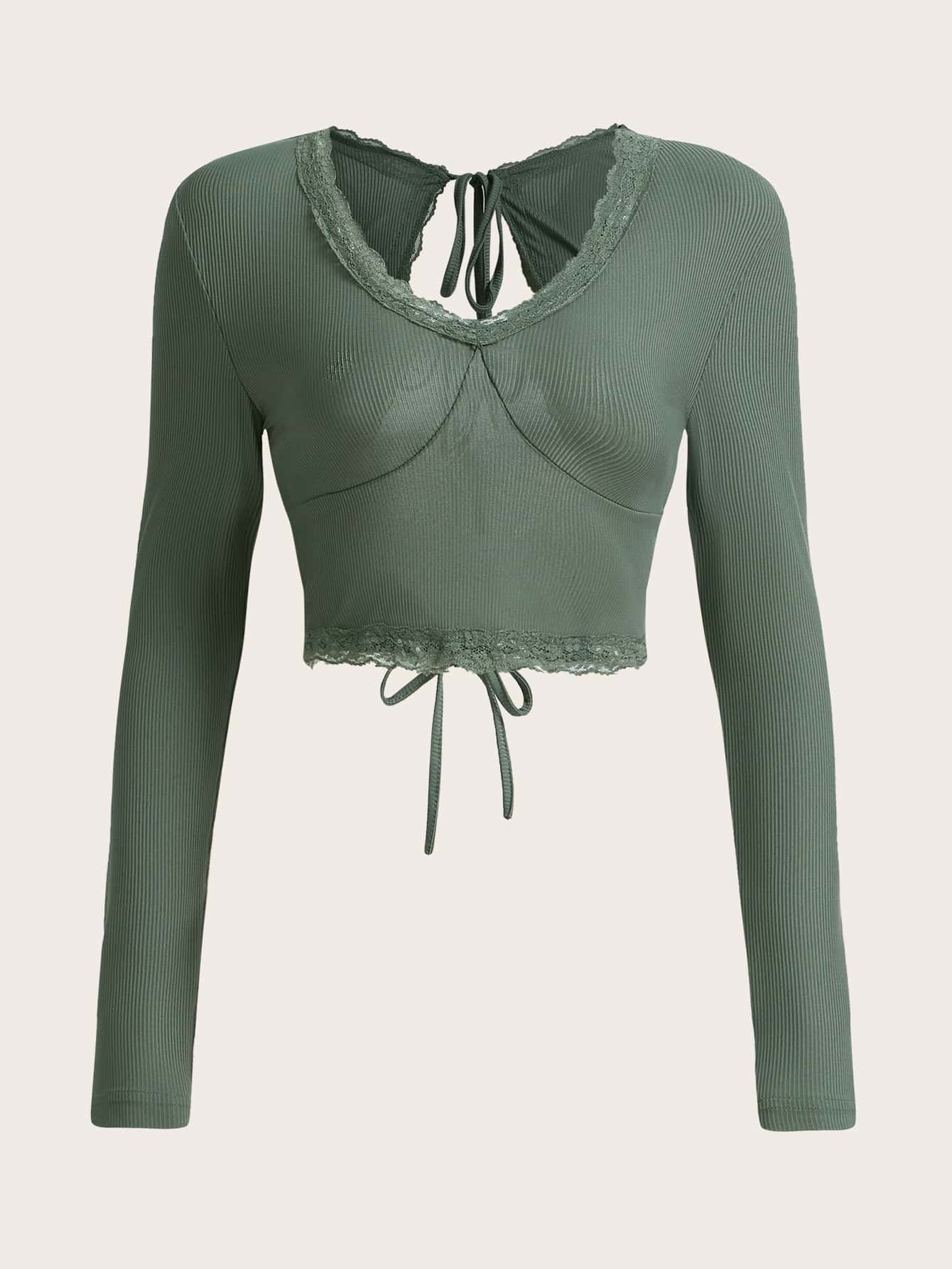 T-shirt court en dentelle dos-nu à nœud côtelé