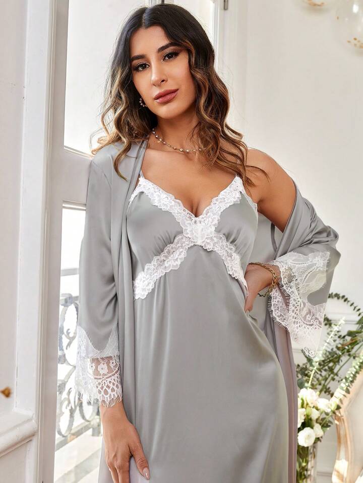 Nuisette à fines brides à bordure en dentelle en satin avec peignoir ceinturé