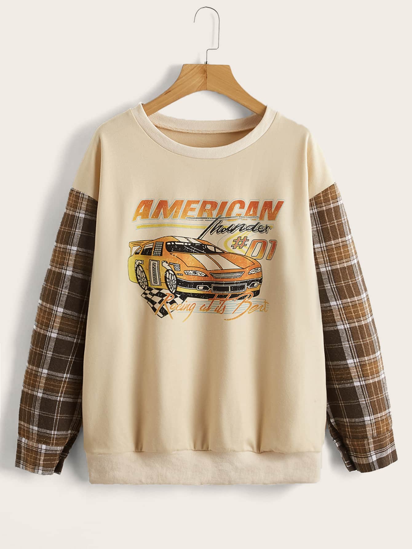 Sweat-shirt à carreaux à motif de lettre et de voiture